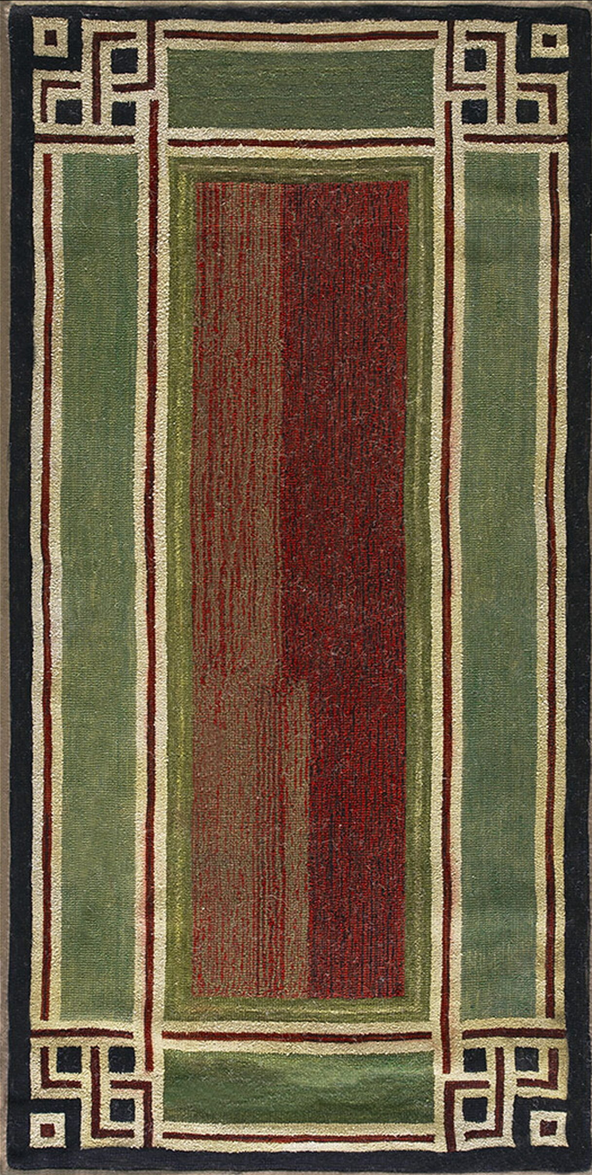 The palette is defined by deep, saturated tones, featuring a rich central field of variegated reds and maroons flanked by broad panels of muted sage green. This careful composition creates a dynamic, yet balanced, display of color, aligning it with sophisticated multicolor jewel tone rugs that capture the artistic spirit of the early Art Deco era.
