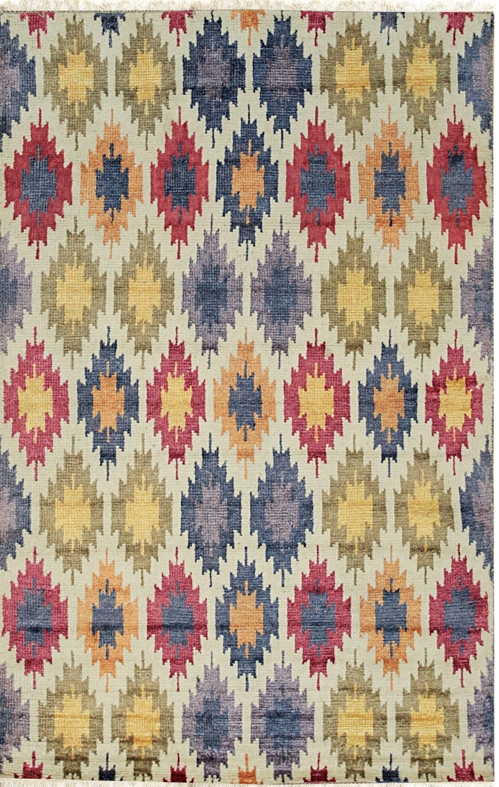 The design features a complex, all-over lattice of serrated diamond motifs, creating a powerful optical rhythm. The rich, varied palette—incorporating deep indigo, warm gold, terracotta, and crimson—makes this an exemplary piece among multicolor jewel tone rugs. Each stylized starburst unit is delineated by a neutral, creamy ground, allowing the saturated colors to emerge with clarity and definition.