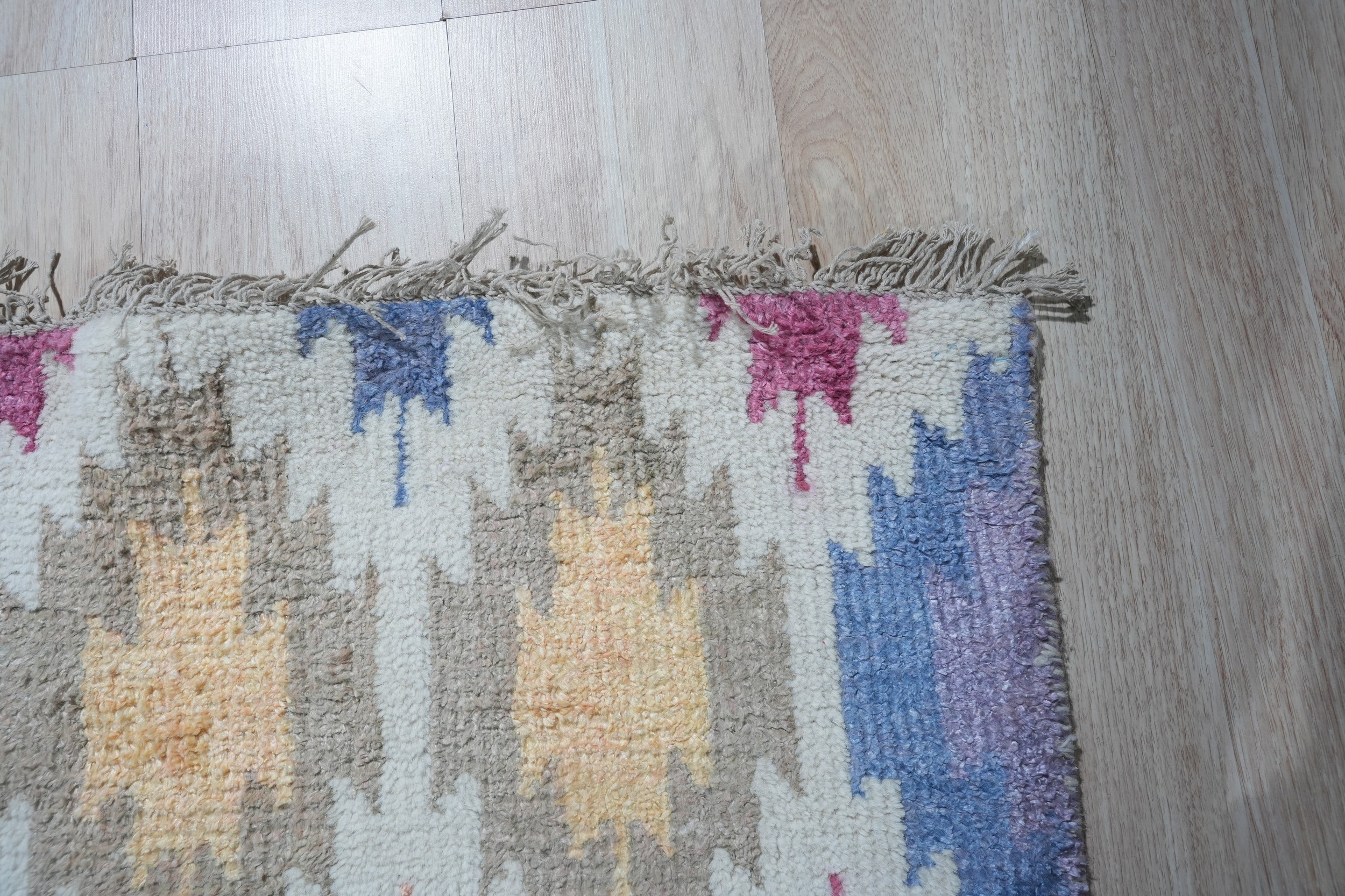 While the pattern nods to tribal textile traditions, the refined execution and balanced coloration ensure its relevance in sophisticated modern interiors. Whether anchoring a living room or providing structure to longer spaces, this aesthetic versatility extends even to hallway runner rugs when woven in appropriate dimensions. The palette is carefully modulated, avoiding harsh contrasts while maintaining high visual energy.