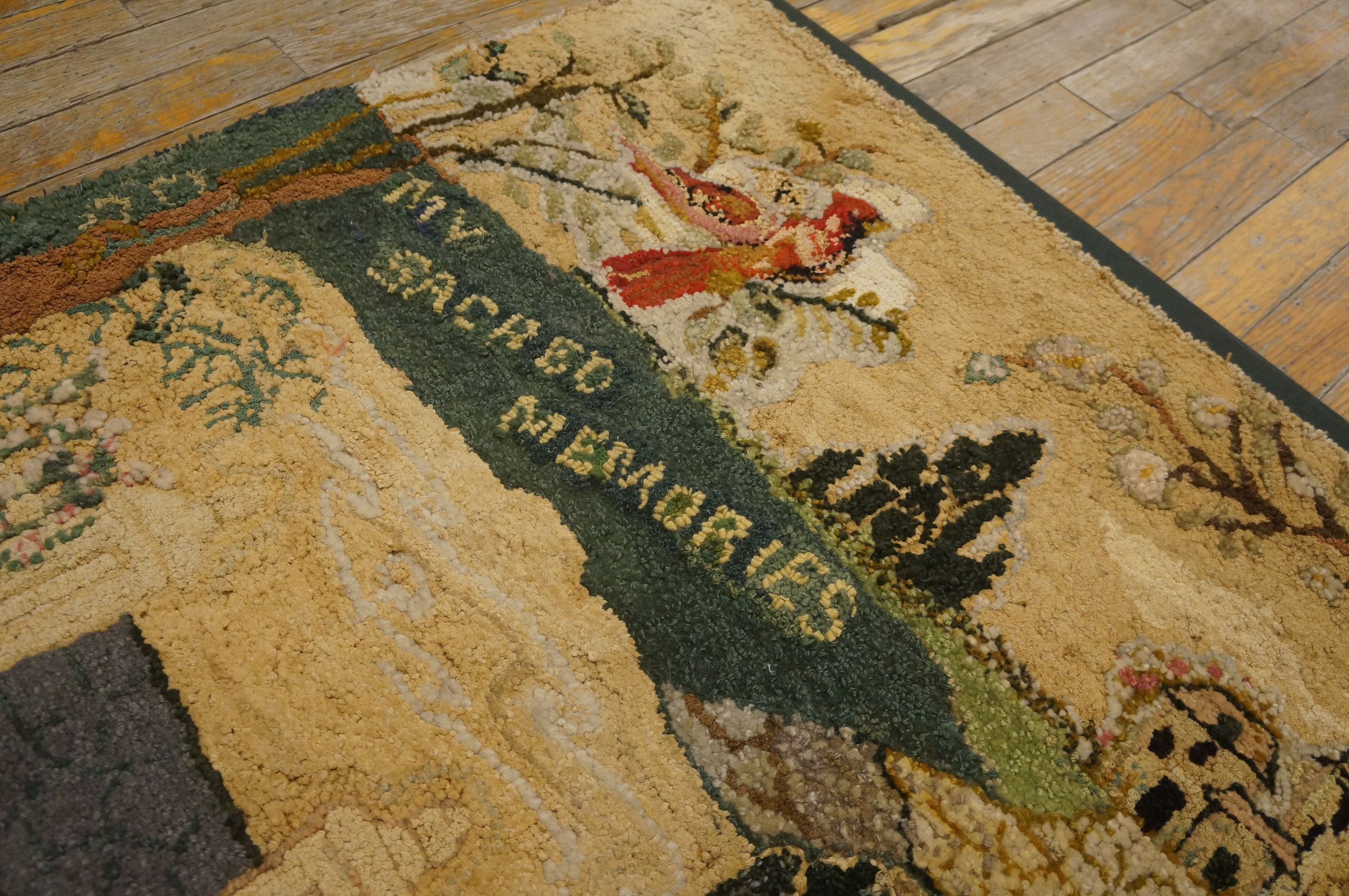 This textile is a deeply personal creation, a characteristic often found in domestic American needlework. The inscription “MY SACRED MEMORIES” is prominently featured, lending the piece an intimate, narrative quality rarely seen in commercial production. Given its dimensions (2.03ft x 3.02ft), it functions perfectly as one of the highly desirable Small Scatter Size Rugs (2.03ft x 3.02ft), ideal for adding a focal point to a hallway or beside a bed.