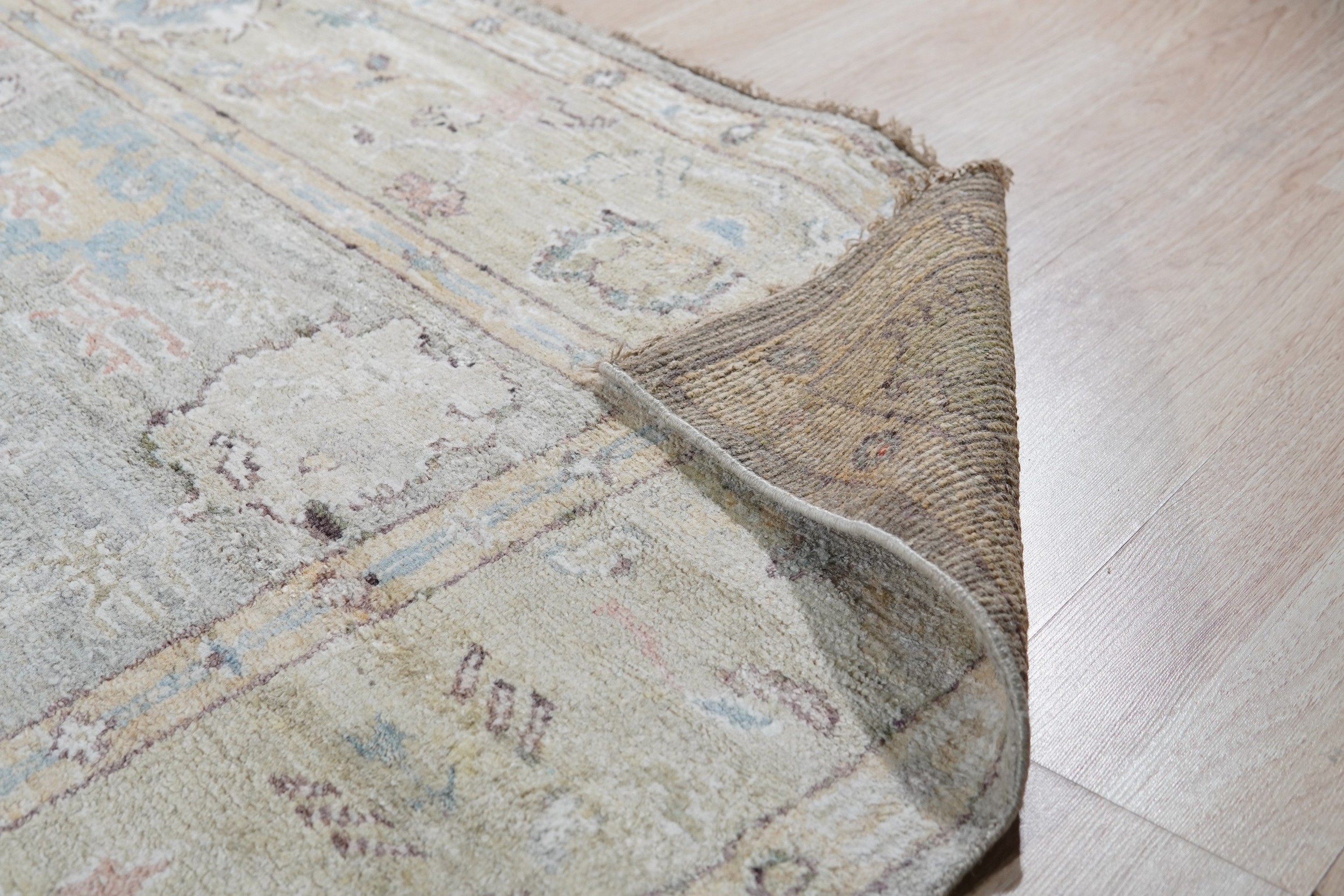 The field presents a sophisticated, almost ethereal palette, dominated by soft, cool tones that lean heavily toward a pale gray color rugs. Subtle shifts into light olive and ivory create depth, allowing the overall composition to function as a refined neutral anchor in contemporary or transitional settings.