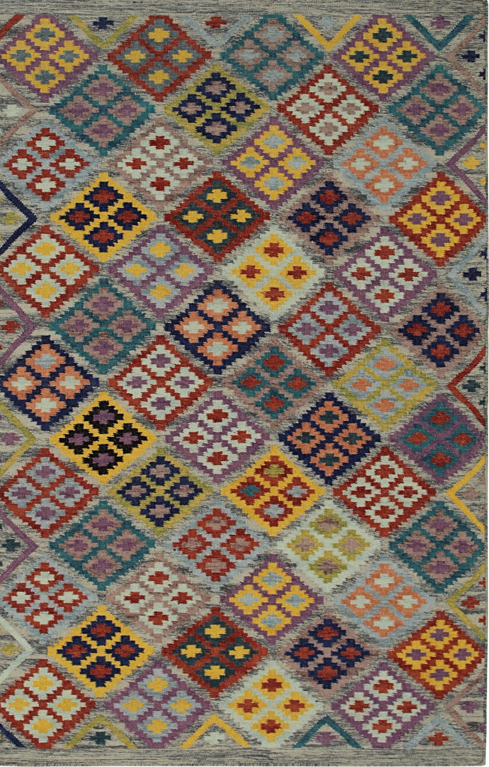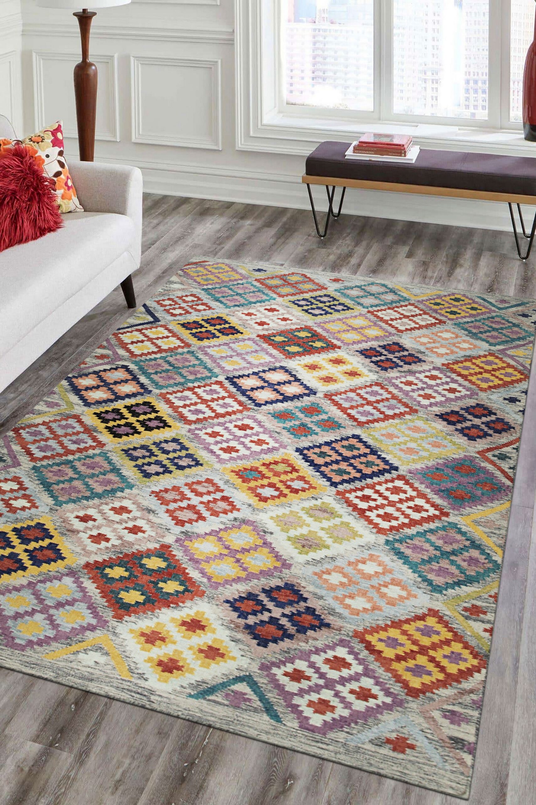 Nadia Kilim Multicolor Flatweave Wool Rug, Country of Origin: India. This exceptional flatweave piece showcases the enduring craftsmanship of Indian rugs. The design utilizes a vibrant, repeating lattice of large diamond motifs, each filled with intricate, contrasting geometric patterns, lending a dynamic energy to the overall composition.