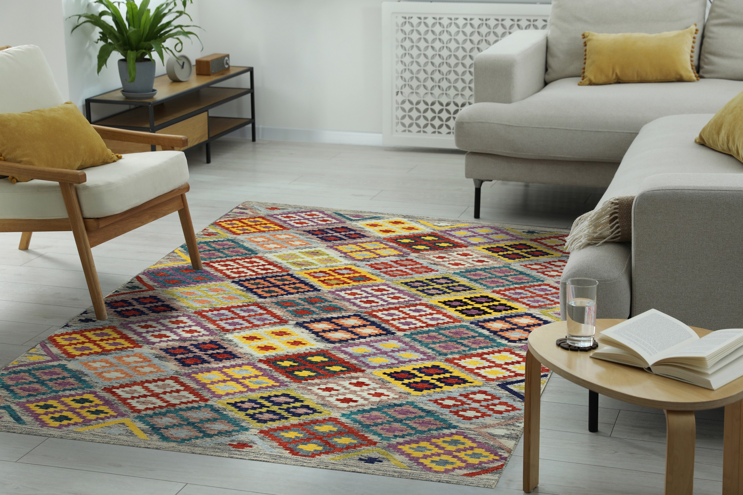Woven entirely from fine wool, the kilim construction ensures a low profile and remarkable durability, suitable for high-traffic areas. The flatweave technique highlights the precision of the geometric design, offering a textural element that feels both rustic and refined. This piece is part of our curated collection of new area rugs.