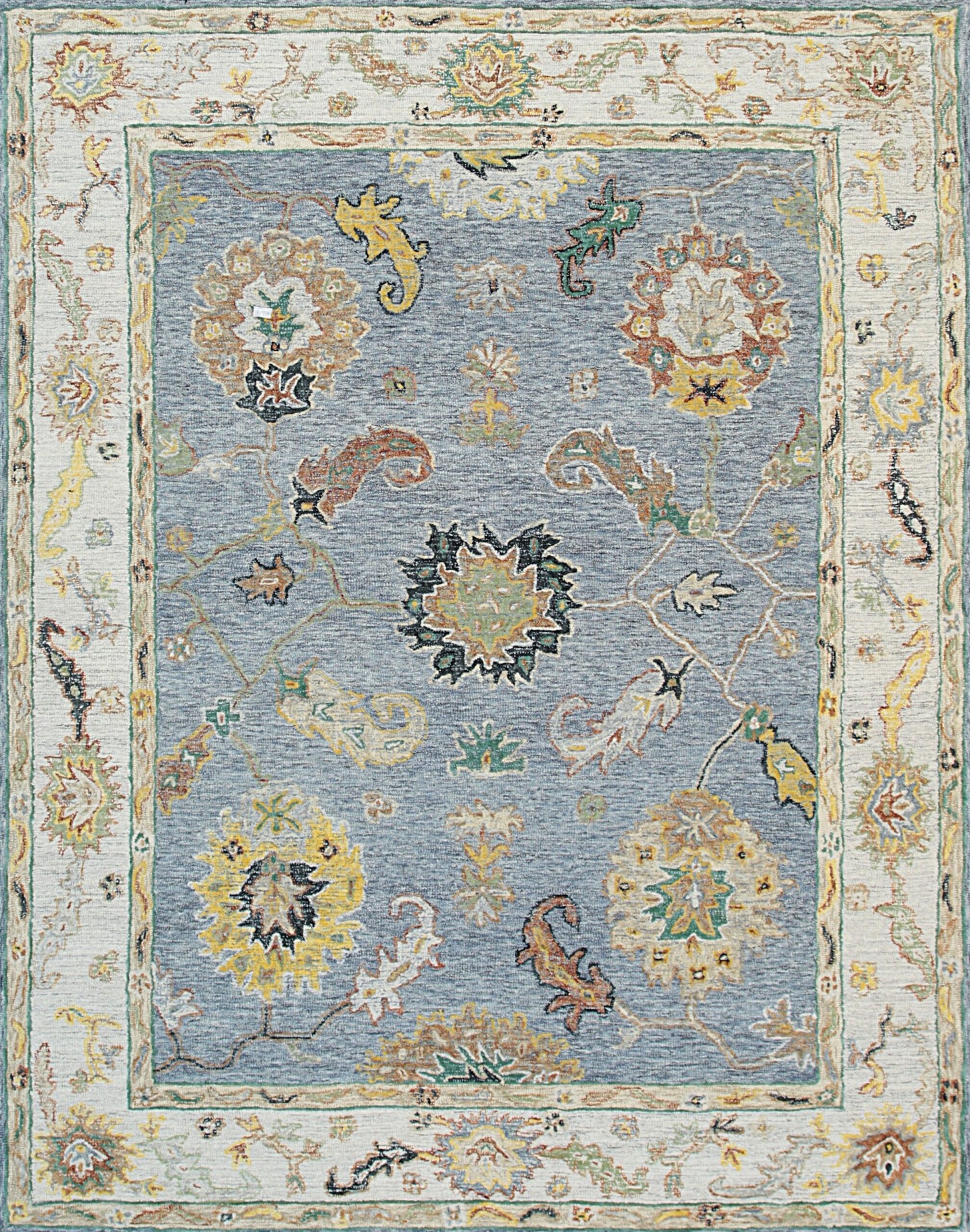 The central field is defined by a sophisticated, heathered blue-gray ground, providing a neutral yet dynamic backdrop for the expansive motifs. The intentional use of a tonal gray color rugs palette ensures versatility, allowing the piece to integrate seamlessly into both traditional and contemporary interiors. Accents of ochre, sage, and rust subtly illuminate the stylized palmettes and sweeping vinery.