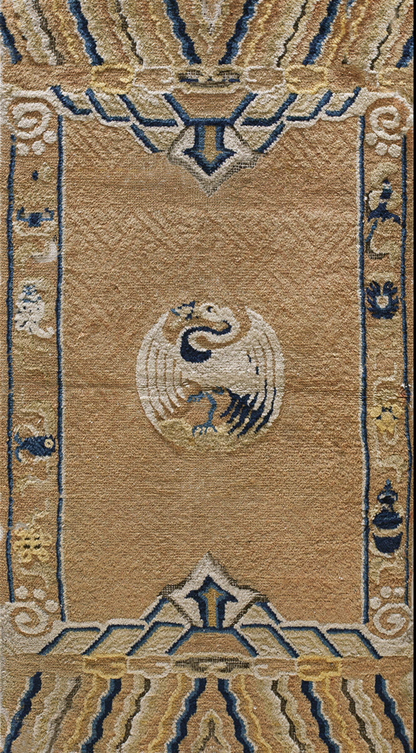 The field is dominated by a warm, oxidized camel tone, providing a rich, textural backdrop for the limited use of deep indigo and pale gold. This reliance on a neutral ground elevates it among ivory color rugs, allowing the central symbolic motif—a magnificent crane or phoenix—to command immediate attention, rendered in contrasting ivory and navy wools.