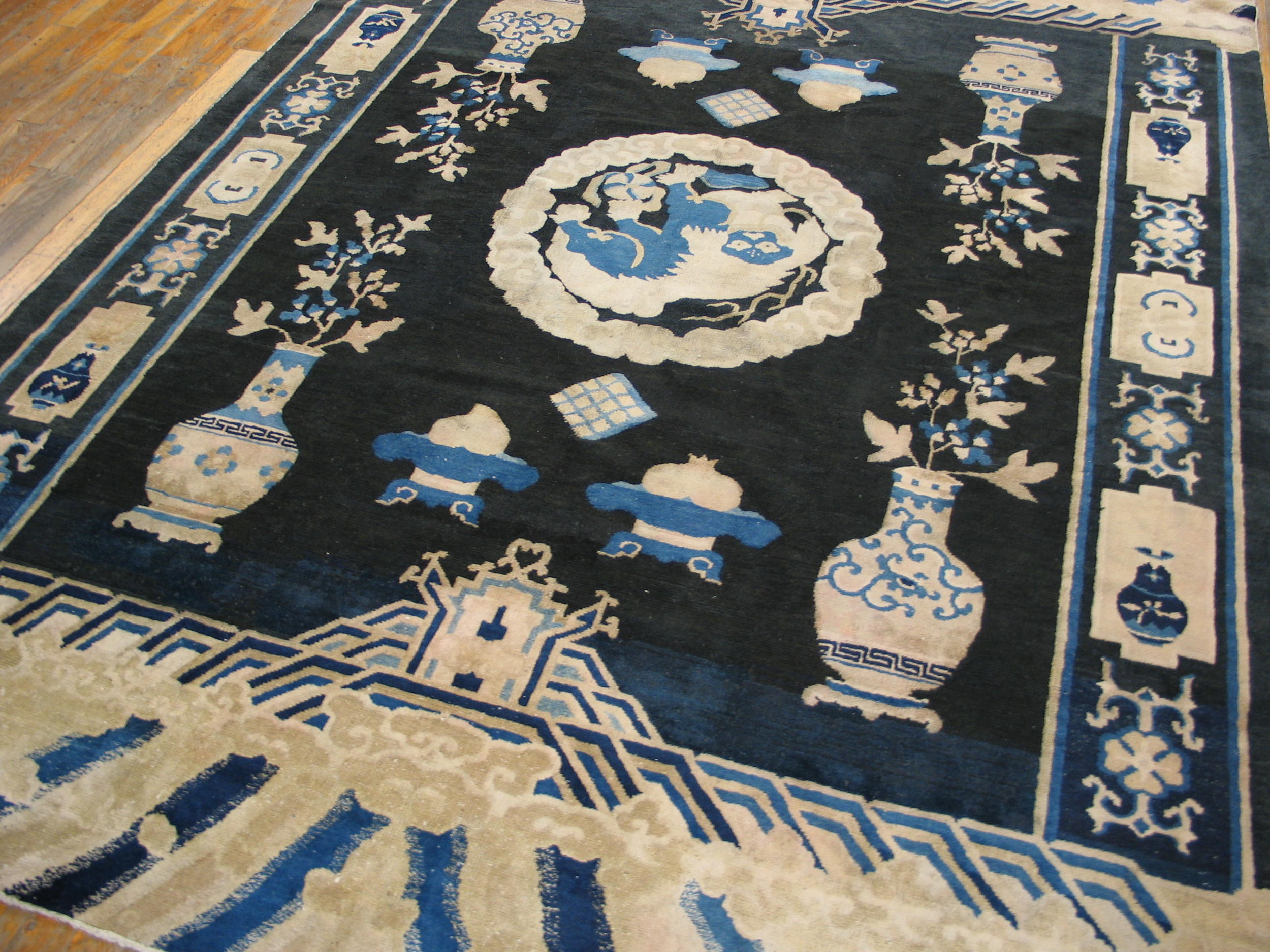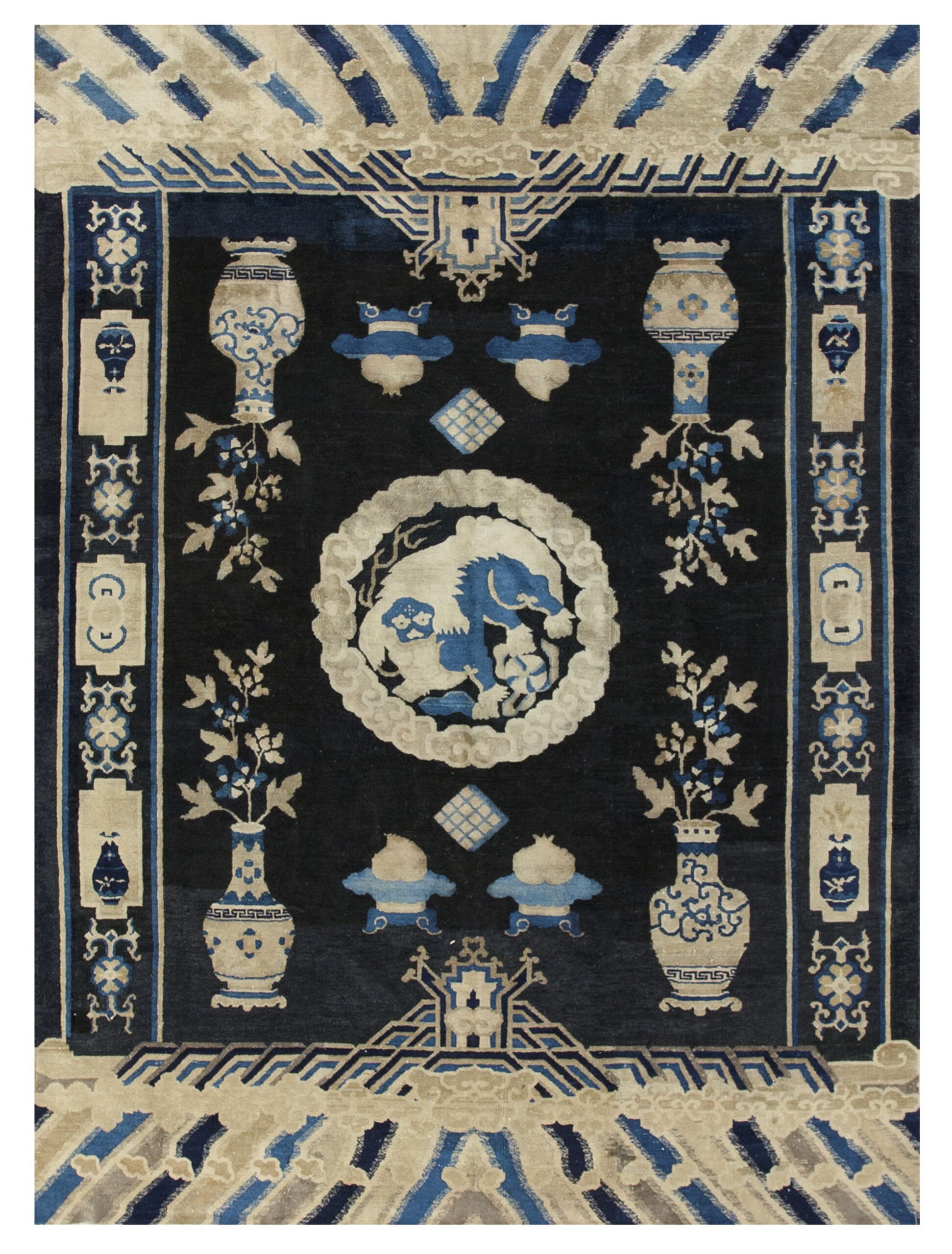 The dramatic field is rendered in a deep indigo that reads as a true black color rugs, providing a powerful backdrop for the intricate iconography. The central medallion, framed by swirling clouds, depicts a vigorous, stylized animal figure—a classic motif associated with protection and imperial power.