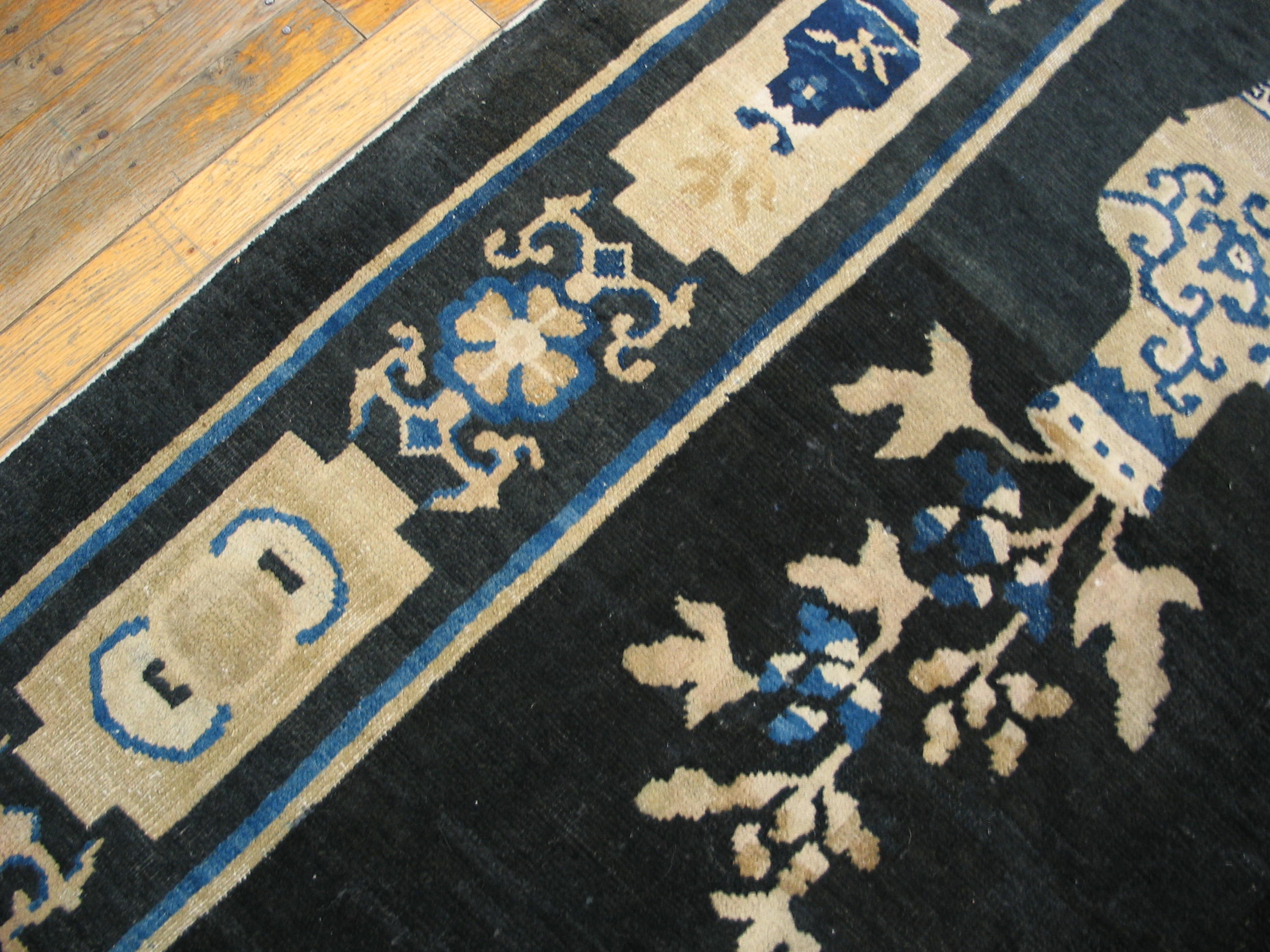 Retaining its original scale and impressive presence, this piece functions perfectly as a room size rugs suitable for a grand library or formal dining area. The contrast between the midnight field and the soft cream and cobalt accents ensures that this historic textile remains a commanding focal point in any sophisticated interior.