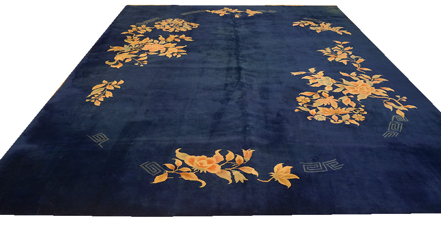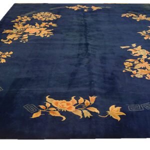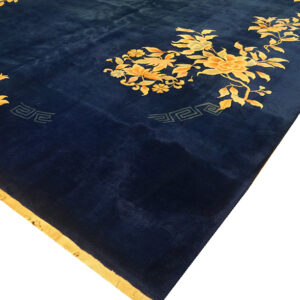 The composition is defined by its dramatic Navy Blue “Open Field.” Unlike the densely patterned “all-over” designs of traditional Persian or earlier Chinese weaving, the Art Deco style prioritizes a vast, minimalist center. This allows the richness of the indigo dye to take center stage, creating a sense of “liquid depth” and tranquility. The floral elements—often featuring stylized peonies, cherry blossoms, or chrysanthemums—are typically relegated to the corners or the border, where they appear to “float” or “creep” into the field with a painterly, asymmetrical elegance.