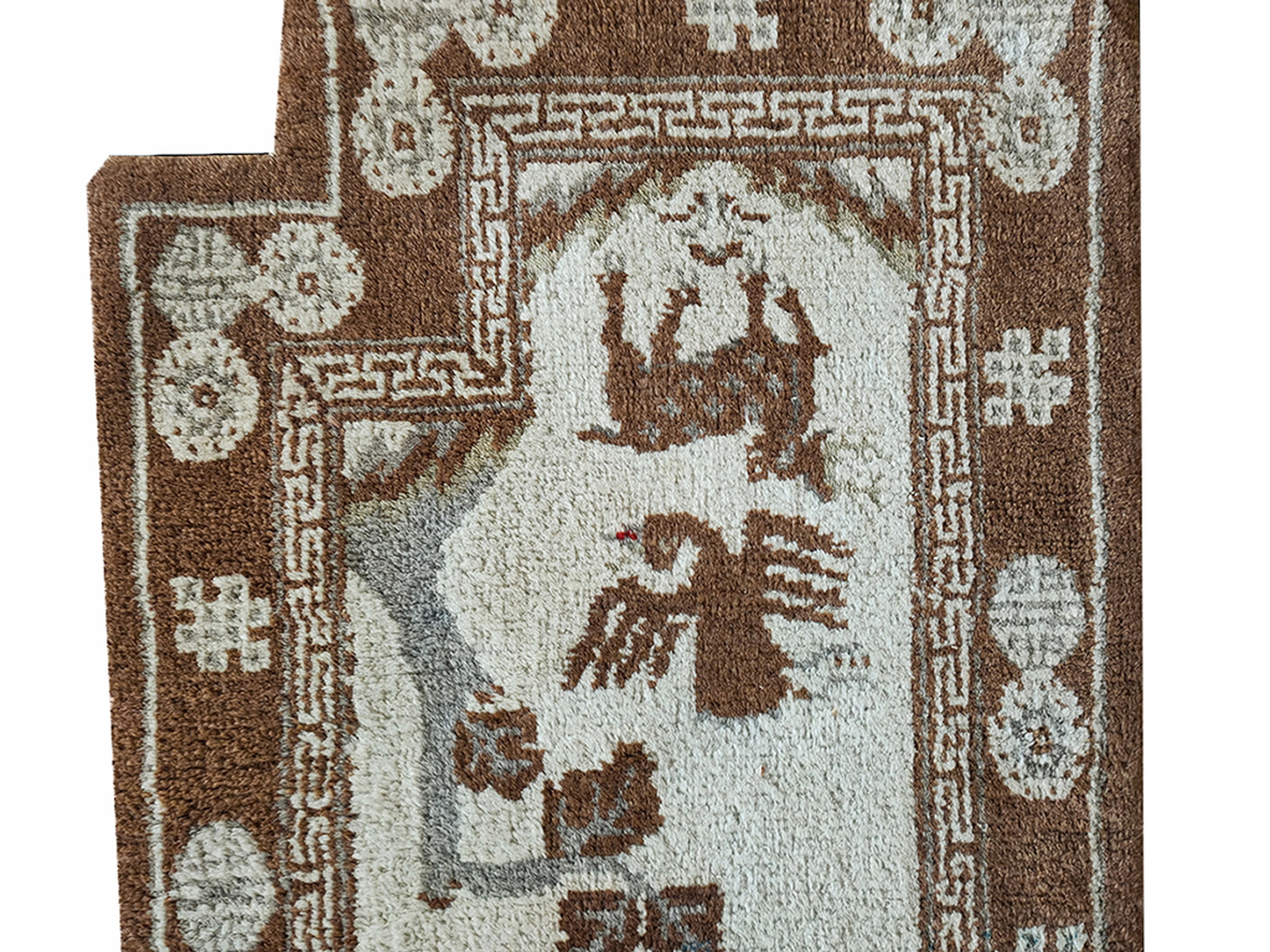 Within the field, the design is highly symbolic, featuring stylized animals—including deer and birds—rendered in a primitive, yet powerful manner reminiscent of shamanistic textiles. This narrative imagery is framed by complex borders that utilize traditional Chinese key-fret patterns, creating a dynamic interplay between the figurative and the geometric rugs elements.