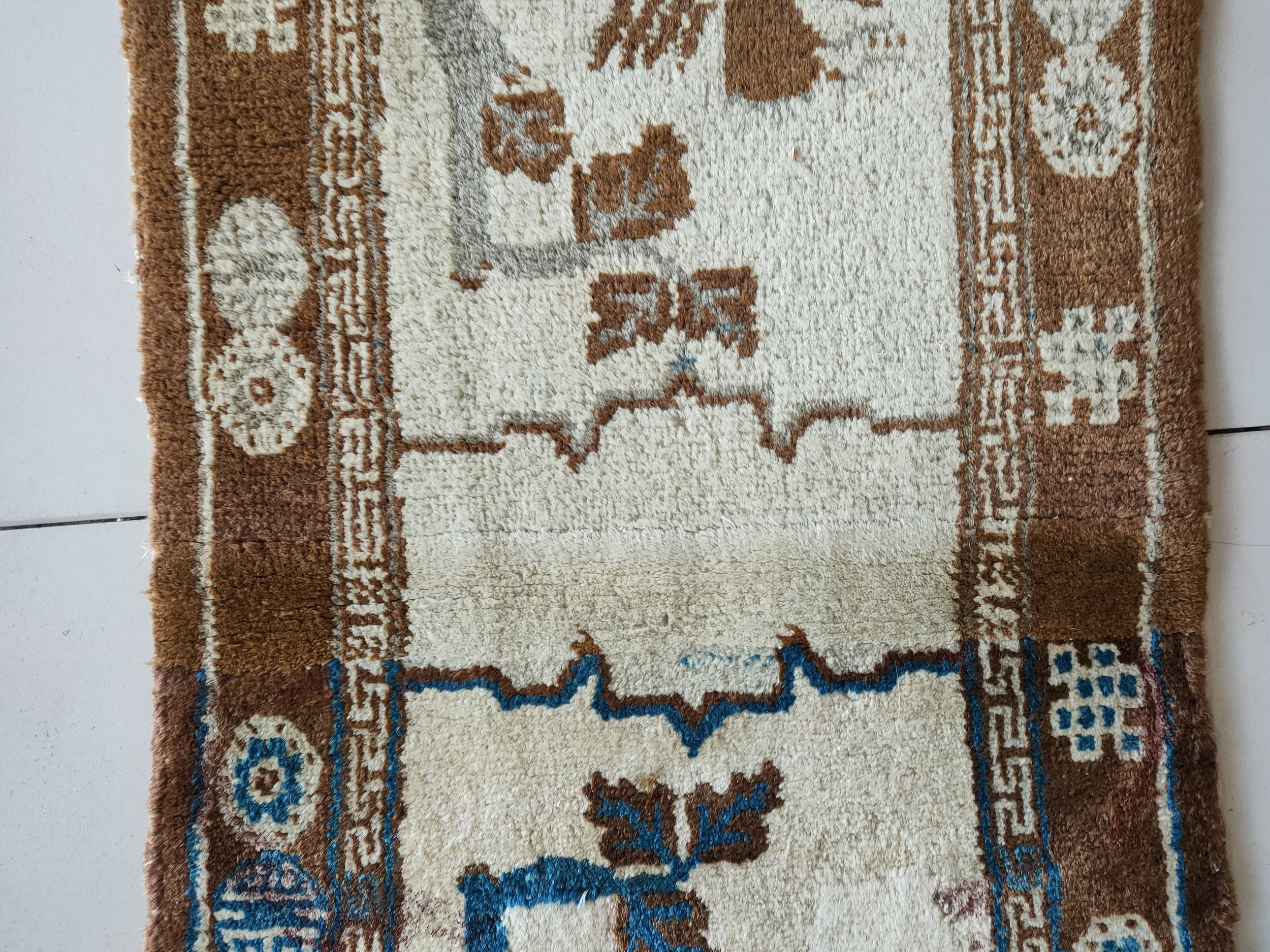 Antique Chinese Chinese Knotted Rug handcrafted, Country of Origin: China, Circa Date: 1930s. This exceptional piece is a striking example of early 20th-century weaving, showcasing the unique pictorial style often found in Chinese rugs of the period. Its long, narrow format suggests it was likely intended as a ceremonial or decorative accent, capturing a fascinating blend of traditional iconography and folk art execution.