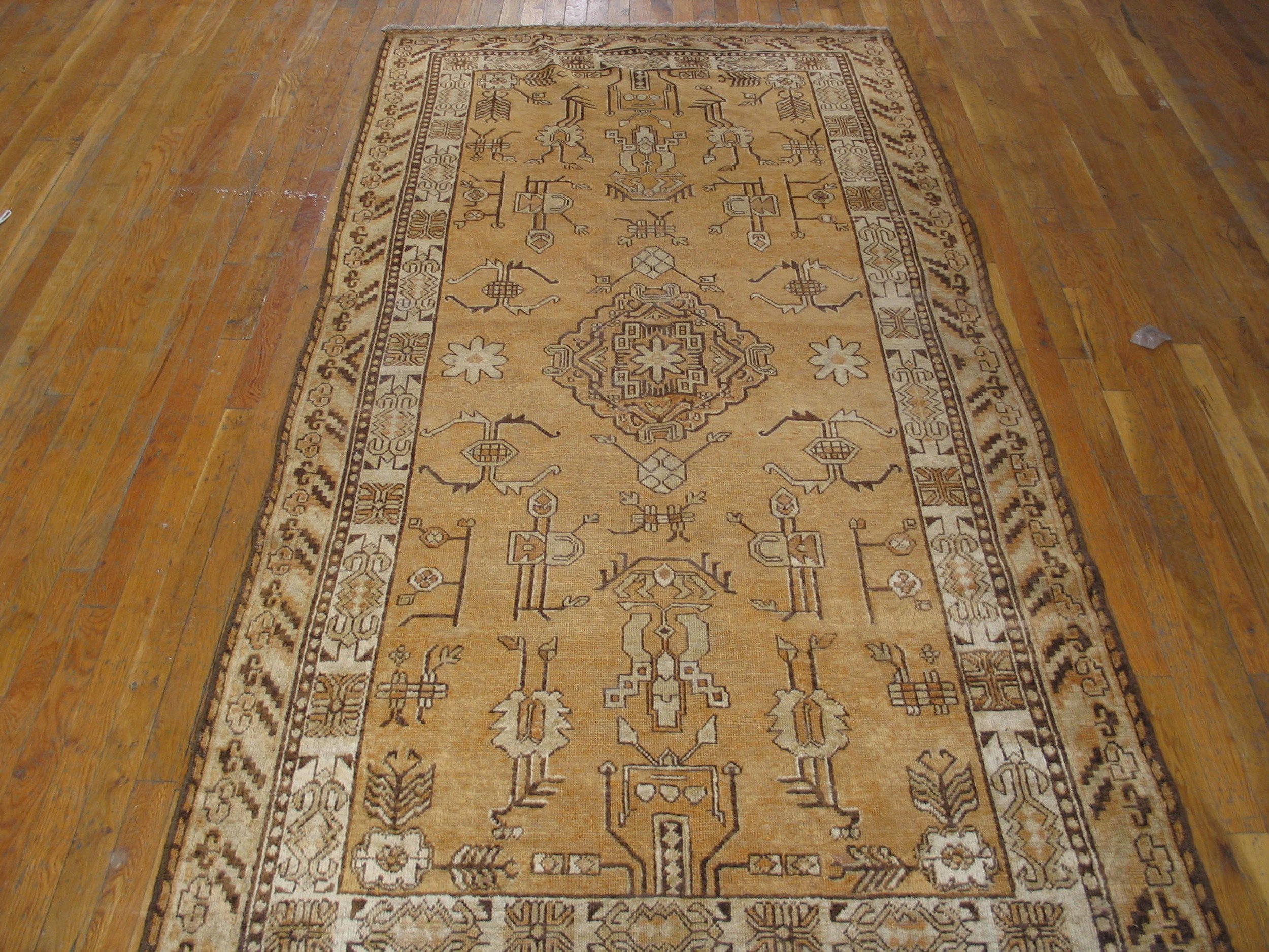 The design employs a highly stylized central medallion surrounded by abstracted human and animal figures, characteristic of early Khotan weaving. While the motifs are traditional, their execution leans toward the abstract, creating a compelling example of geometric rugs that avoids overt naturalism and favors bold, graphic lines.