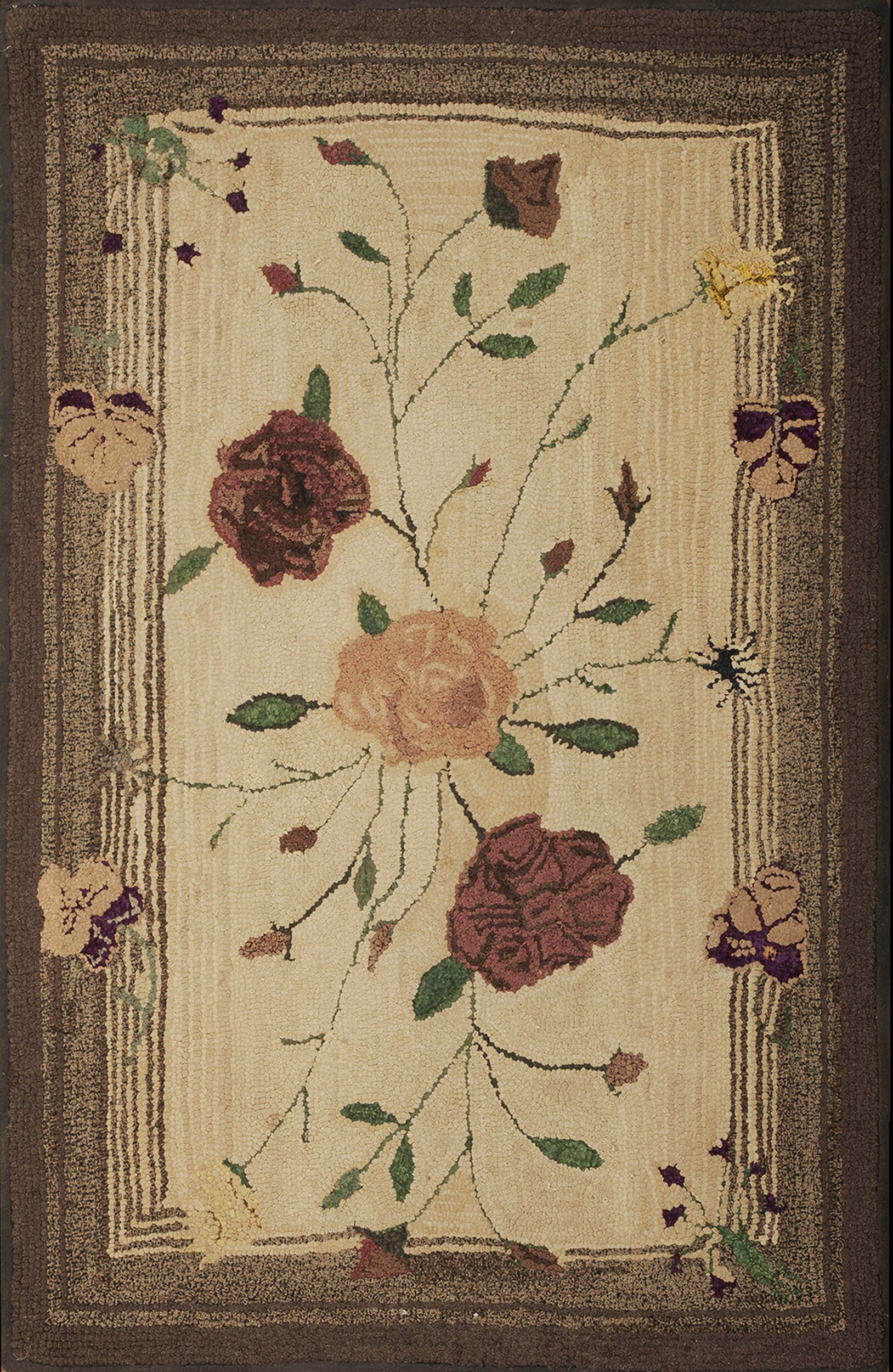 The central design features a graceful, asymmetrical spray of blossoms—likely stylized roses or peonies—characteristic of the most desirable floral rugs. The vine work is delicate, balancing the robust, three-dimensional quality of the hooked wool. The composition is framed by a complex border featuring striated and solid bands of deep taupe and chocolate brown.