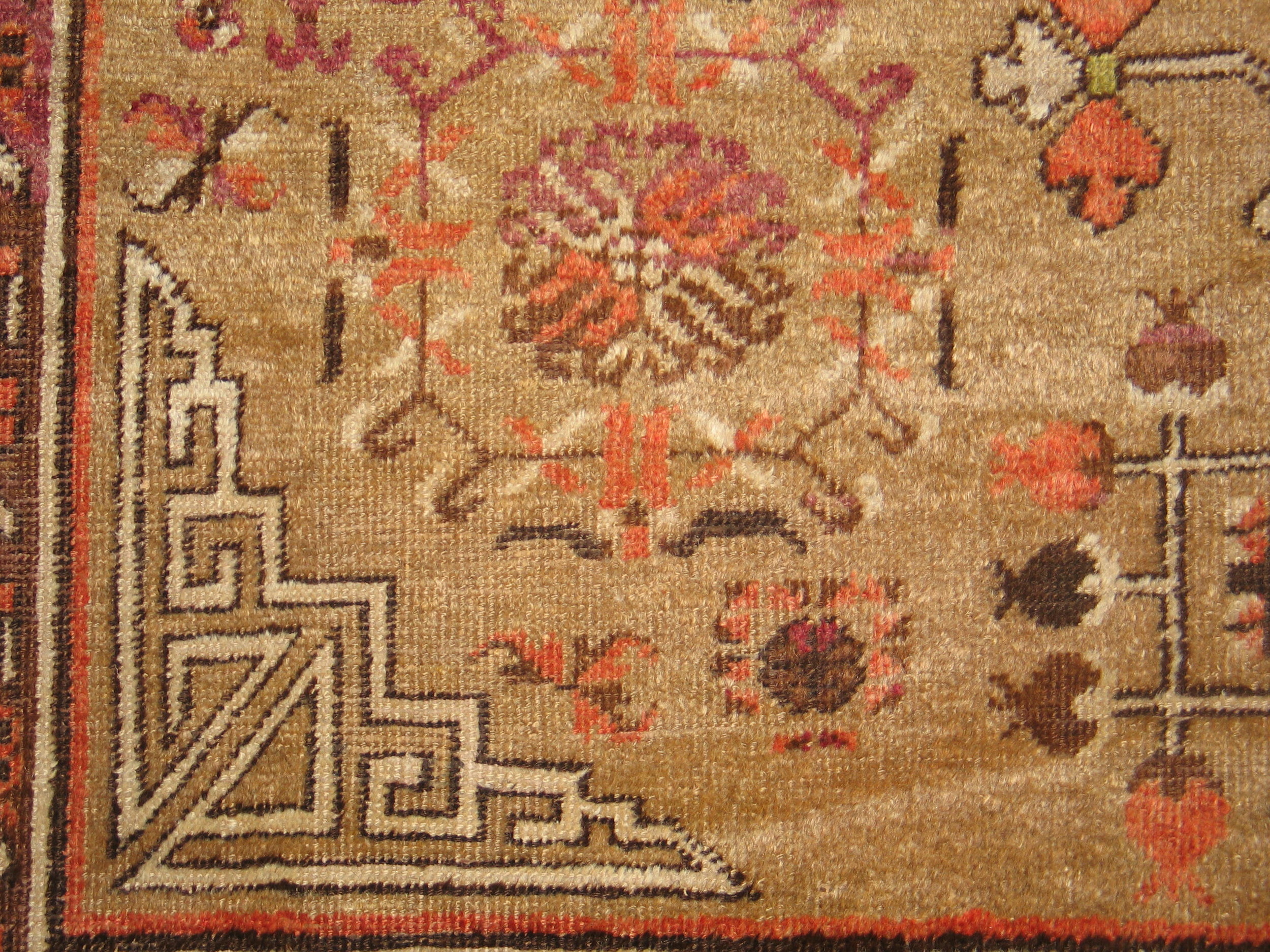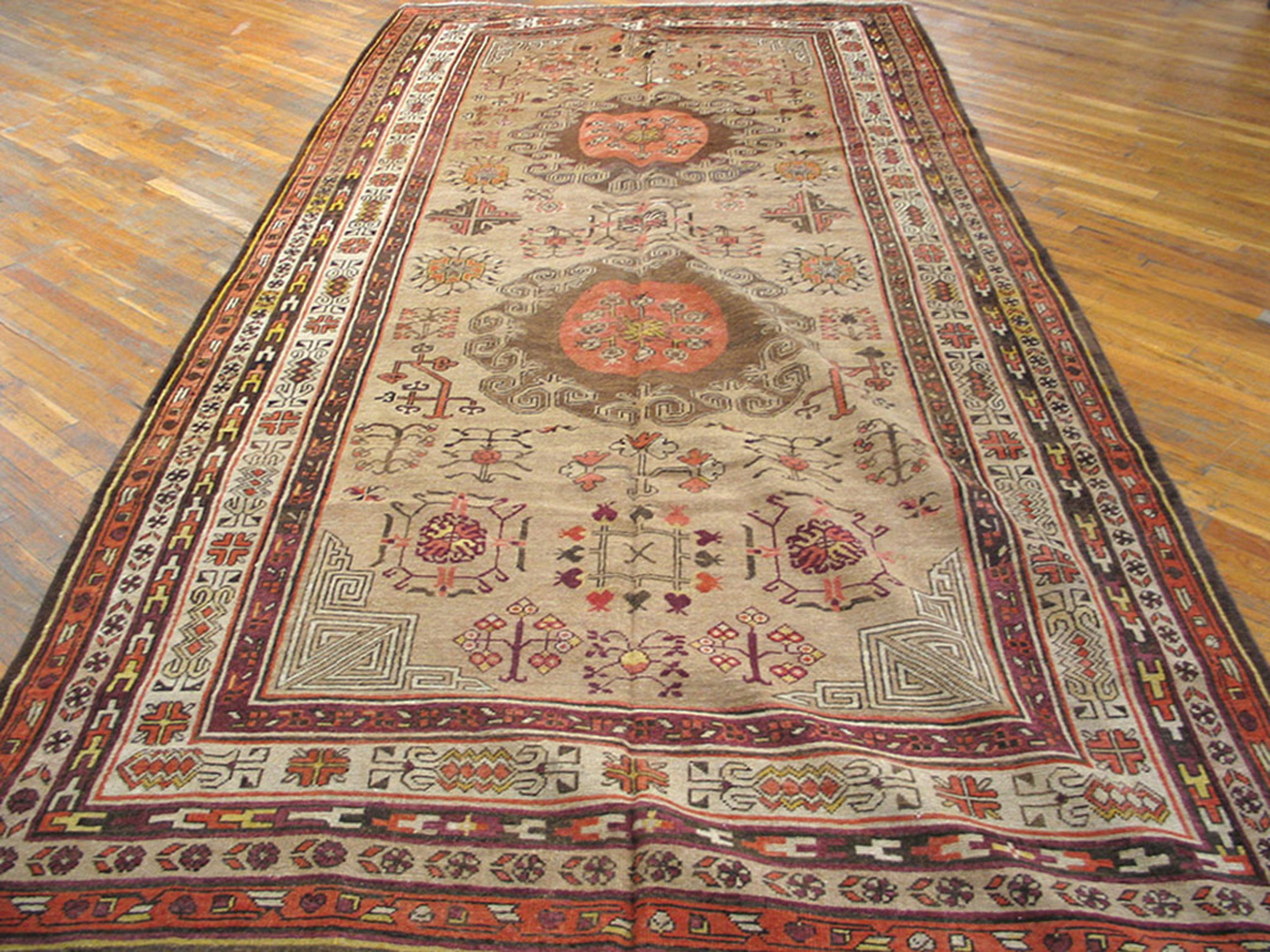 Antique Geometric Medallion Wool Hand Knotted Pile Ivory Beige Cream White 1890s East Turkestan Khotan Rug, Circa Date: 1890s. This compelling hand-knotted wool pile rug presents a sophisticated aesthetic rooted in traditional weaving practices. The durability and rich texture of the wool foundation confirm its status as one of the finest antique rugs available from this period.
