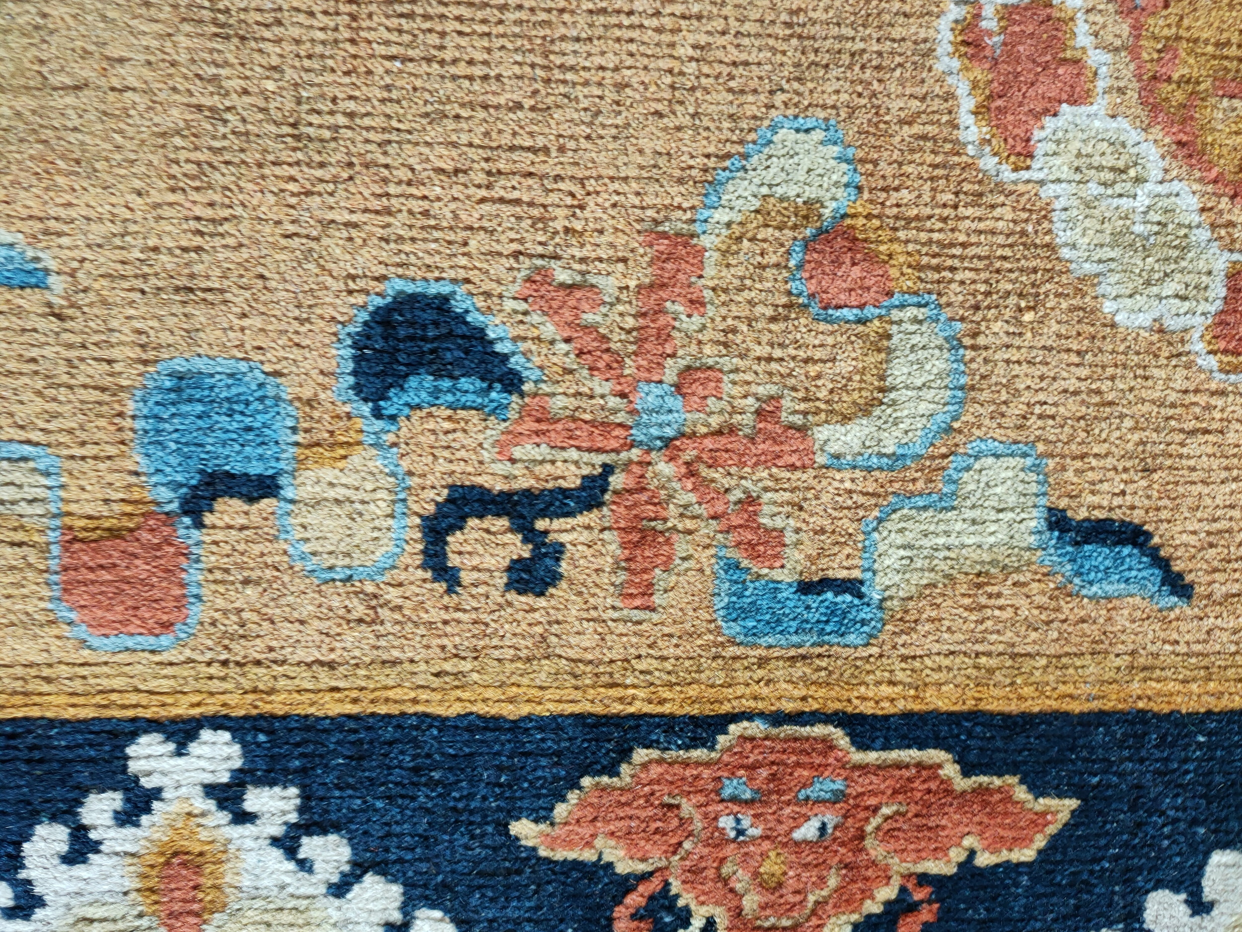 The composition is defined by a serene camel-toned field, providing a sophisticated backdrop for the scattered, stylized motifs rendered in muted blues, pale gold, and soft terracotta. This aesthetic, which favors open space over dense patterning, is the hallmark of the finest peking rugs from this decade. The deep indigo main border provides a necessary structural contrast, framing the delicate interior design.
