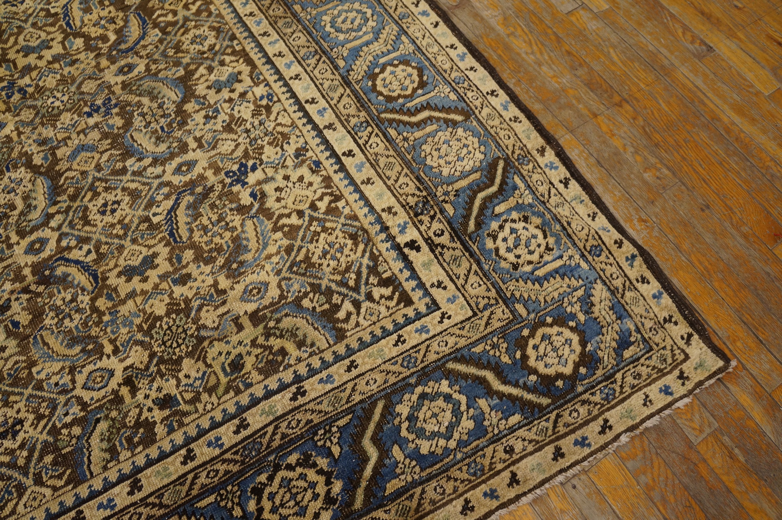 The palette is defined by rich, oxidized tones of deep cocoa and warm beige, beautifully complemented by the striking indigo blue border. Subtle accents of pale terracotta and faded green color rugs emerge within the dense field, testifying to the use of natural dyes that have achieved a magnificent, century-old patina.