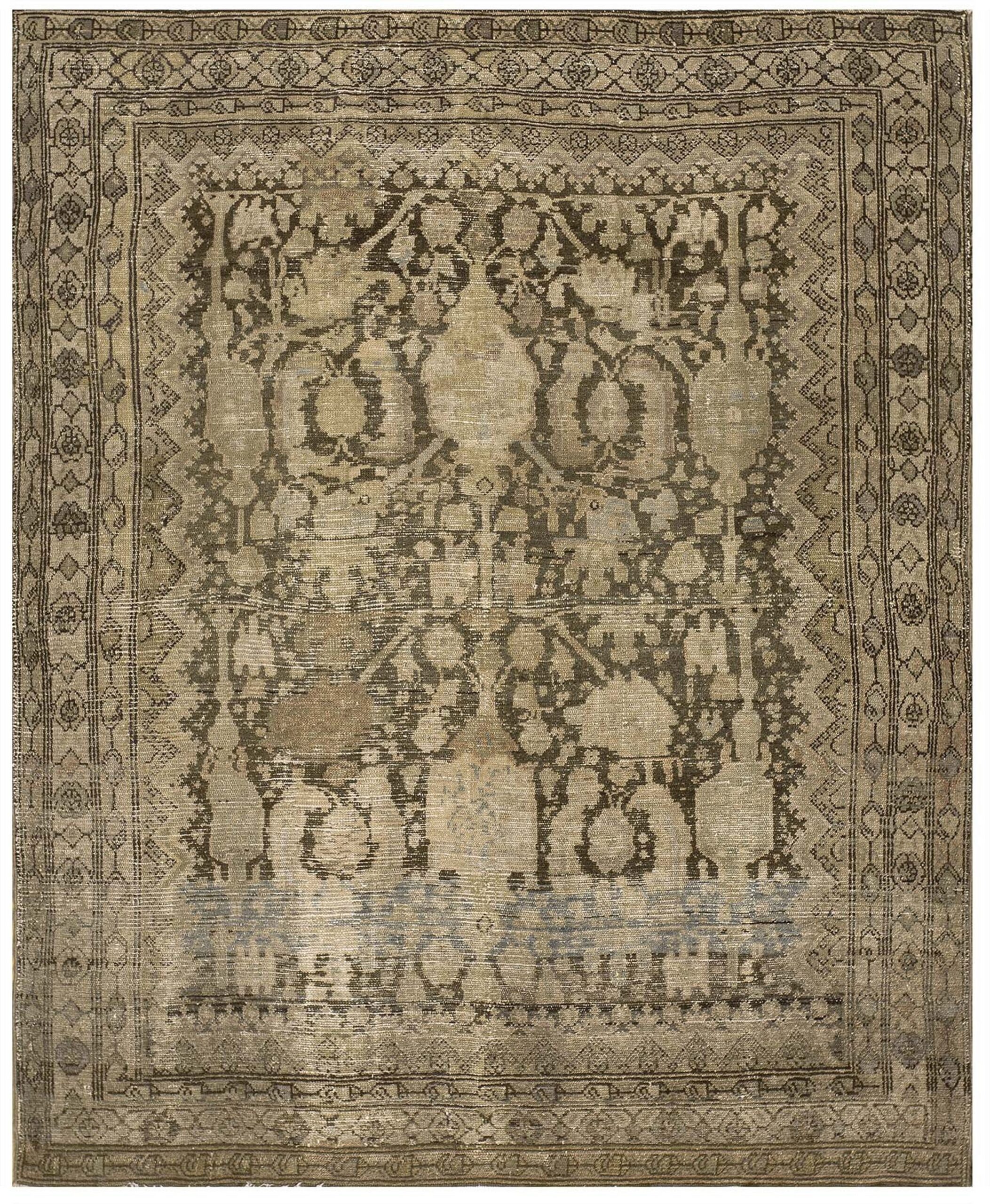 The muted palette is dominated by a field of soft, oxidized wool in shades of taupe and faded brown, set against a background of naturally aged ivory and beige. The severe abrash and extensive wear contribute significantly to the rug’s character, creating a desirable, almost painterly texture that speaks to a century of use and history.