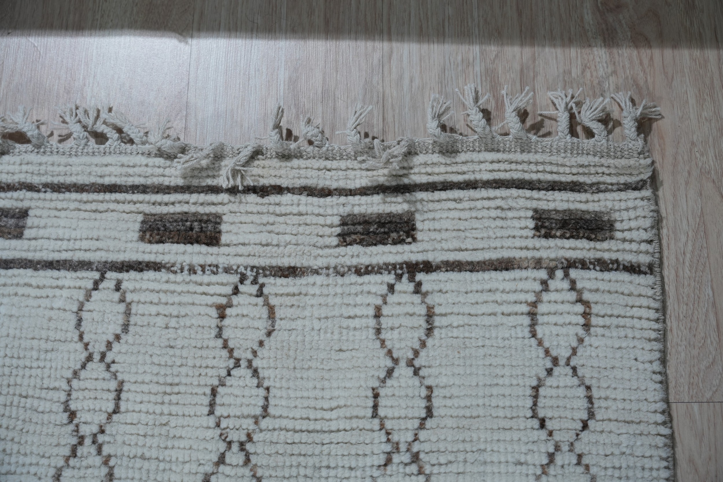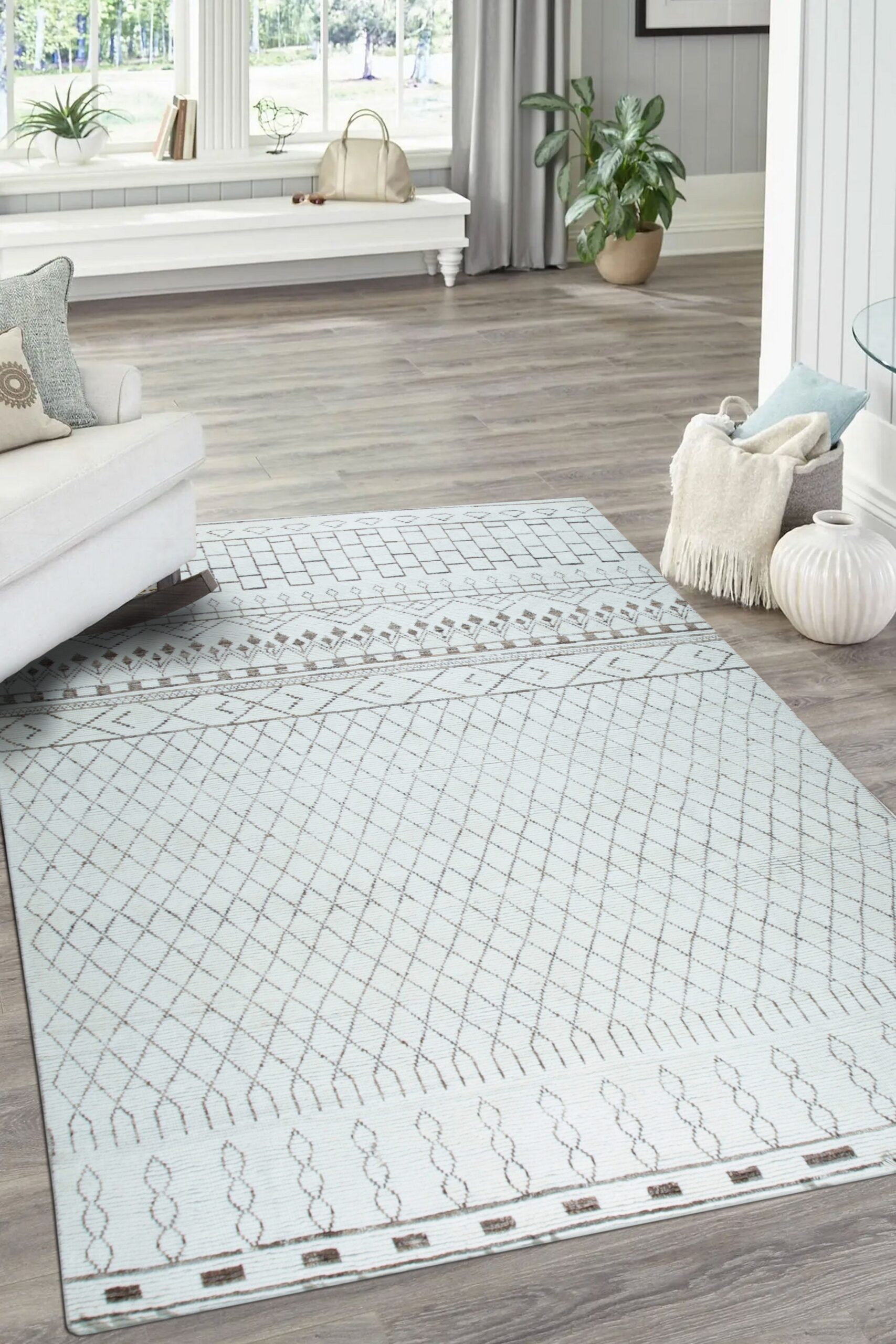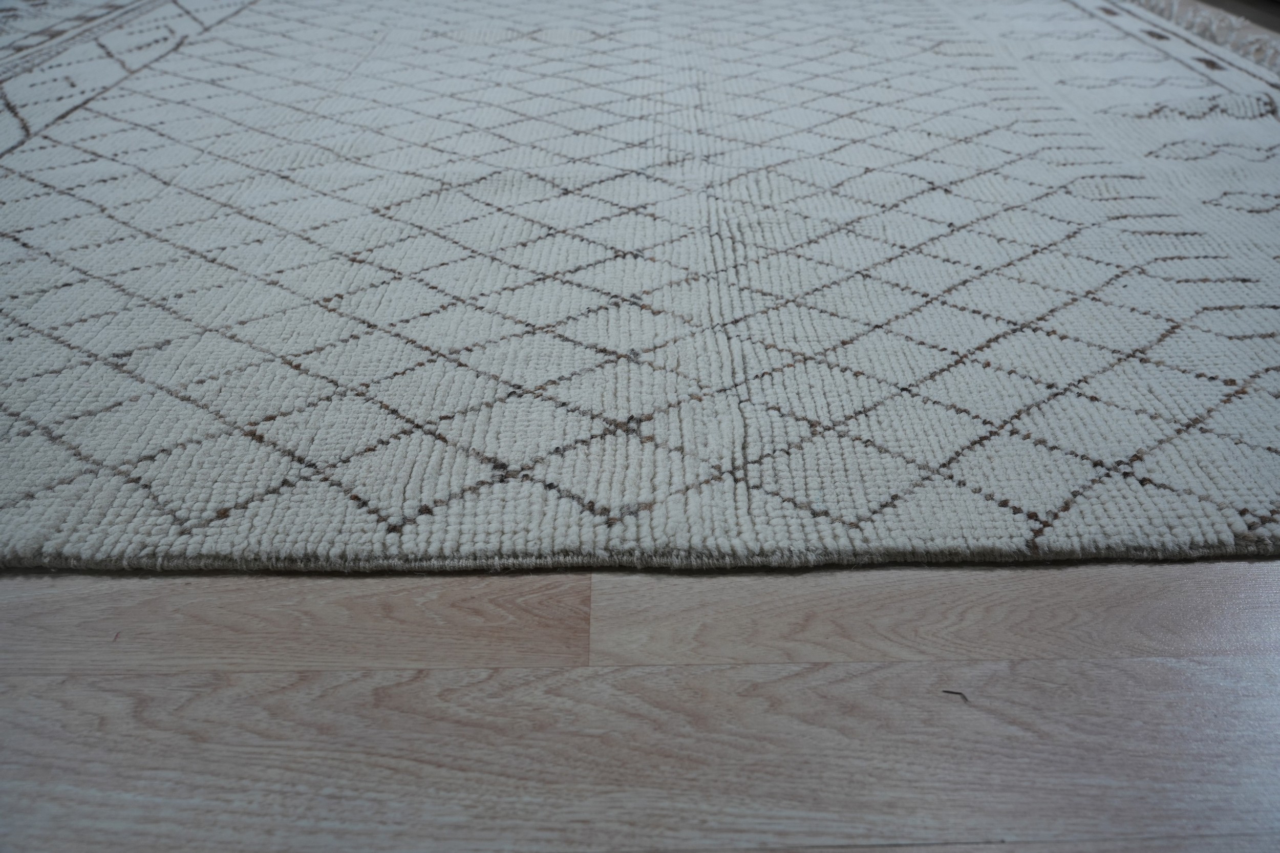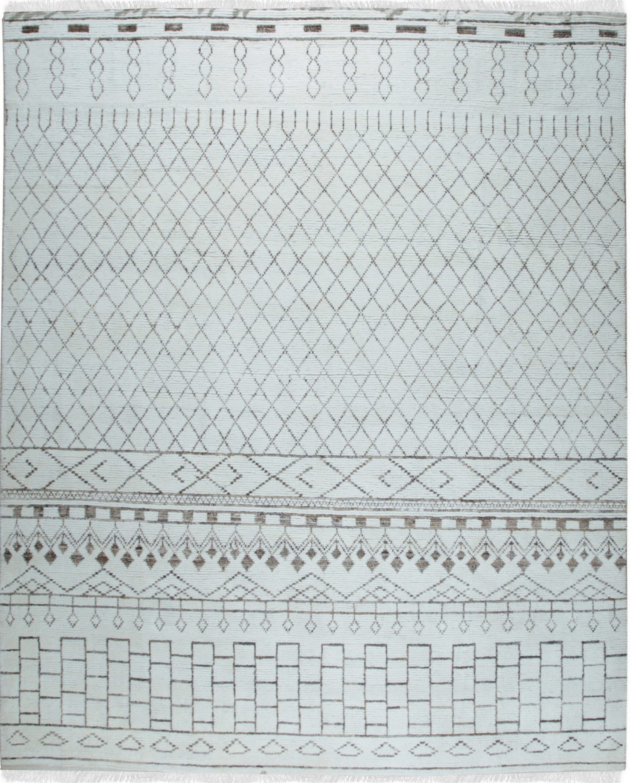 While inspired by traditional Berber aesthetics, the Jasmine rug presents a refined, structured composition. The central field features an expansive diamond lattice, bordered by bands of stacked rectangular blocks and stylized chevron patterns. This blend of heritage inspiration and contemporary structure places it among our finest new area rugs.