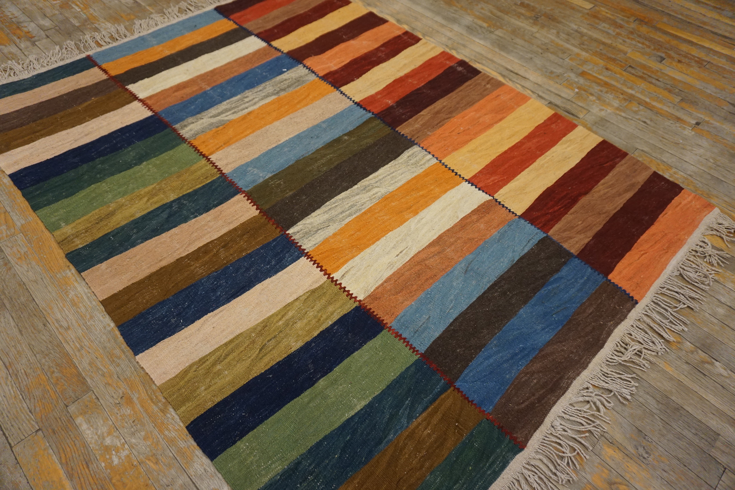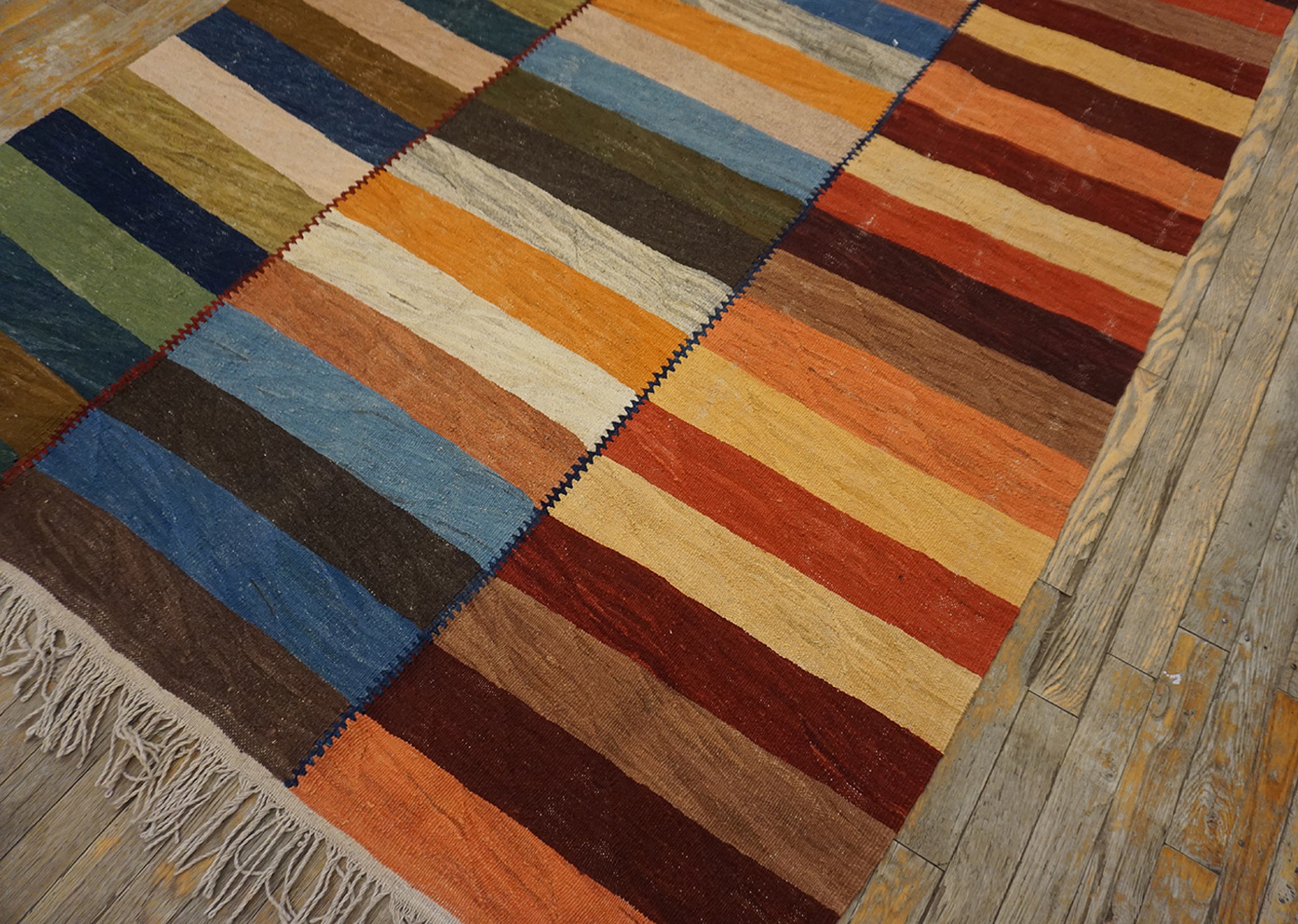 New Modern Contemporary Kilim – N.W. Persian Iran Knotted Rug, Circa Date: Contemporary. This striking textile is a superb example of a modern flat-woven kilim originating from Northwest Persia. Its construction utilizes three distinct vertical panels, expertly joined with visible stitching to create a cohesive and visually dynamic composition.