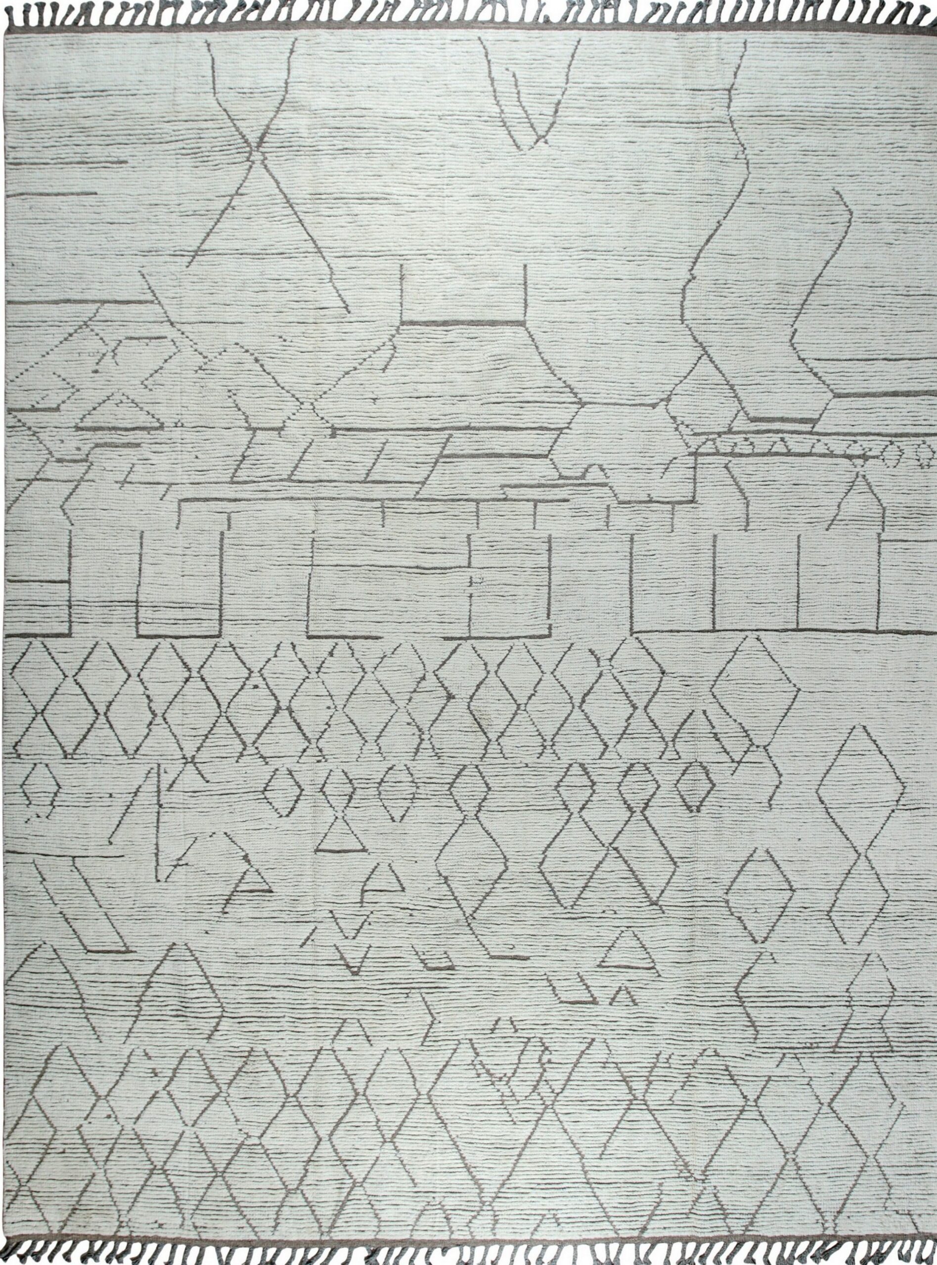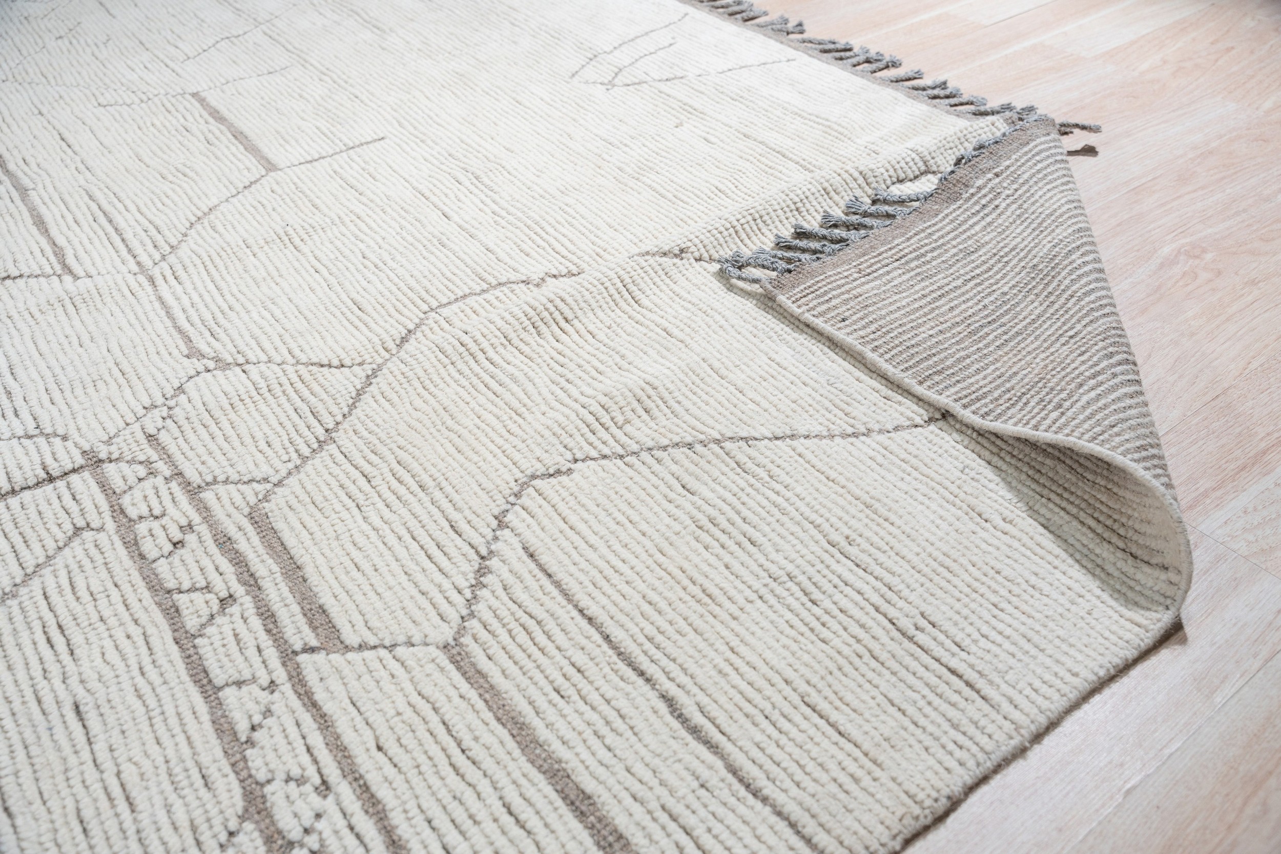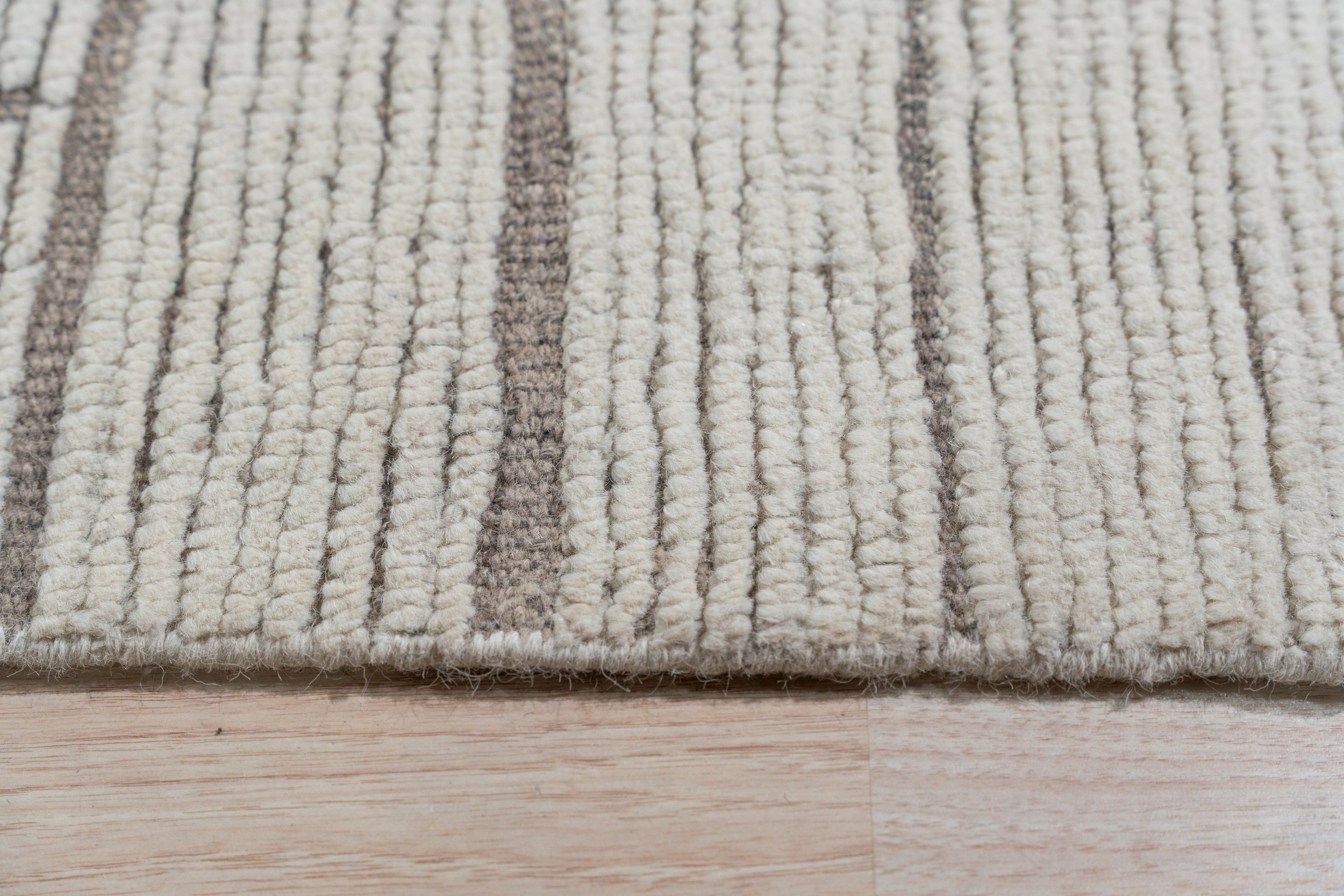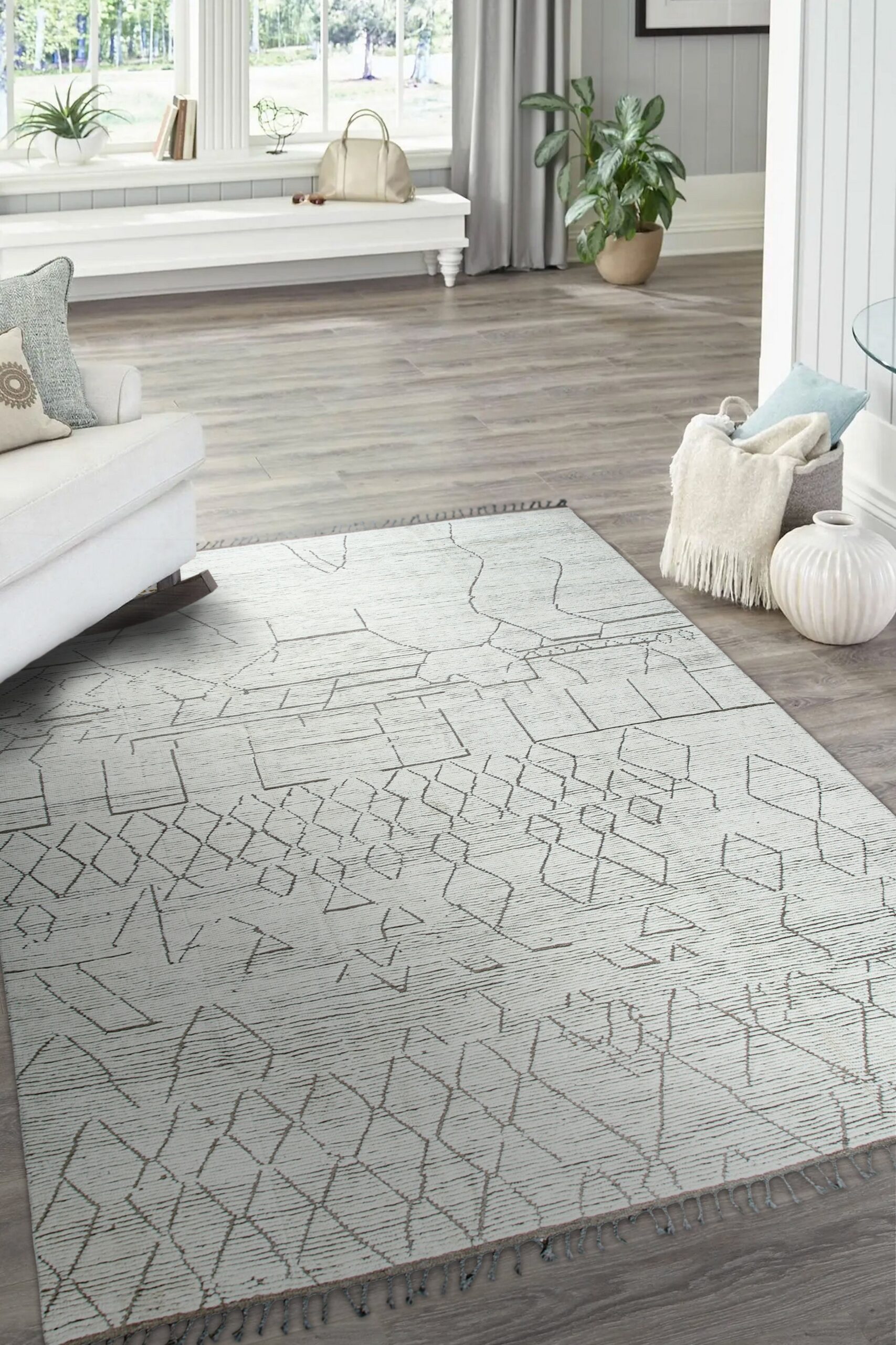 The field features an abstract arrangement of linear motifs and broken geometric shapes rendered in a subtle taupe shade against the light ground. This intentional asymmetry and textural variation define the modern transitional style, making it an ideal anchor for both minimalist and eclectic interiors. This piece is part of our continually evolving selection of new area rugs that blend traditional craftsmanship with current design trends.