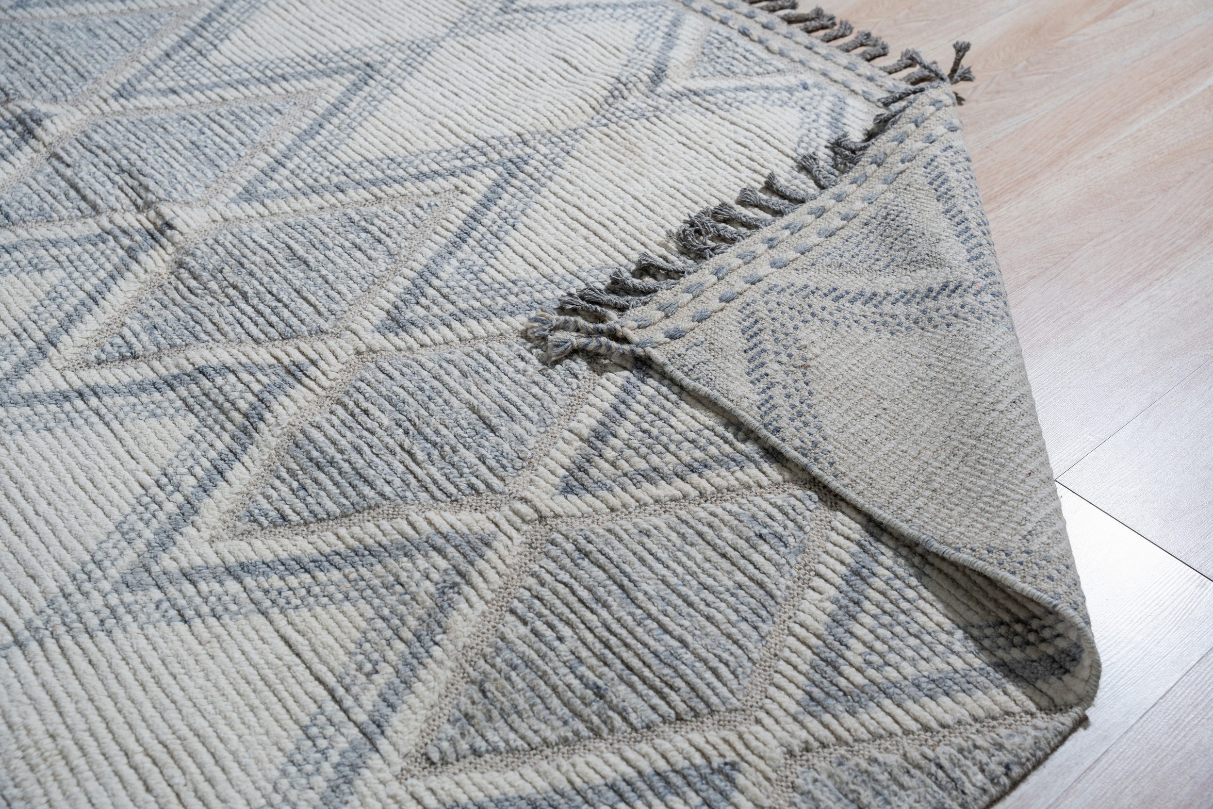 Intricate Marrakech Ivory Hand-Knotted Wool Berber Carpet, Country of Origin: Pakistan. This stunning piece offers a modern interpretation of classic tribal design, featuring a robust, textured wool pile. The craftsmanship reflects the long-standing weaving traditions of Pakistani rugs, blending traditional knotting techniques with contemporary aesthetic demands.