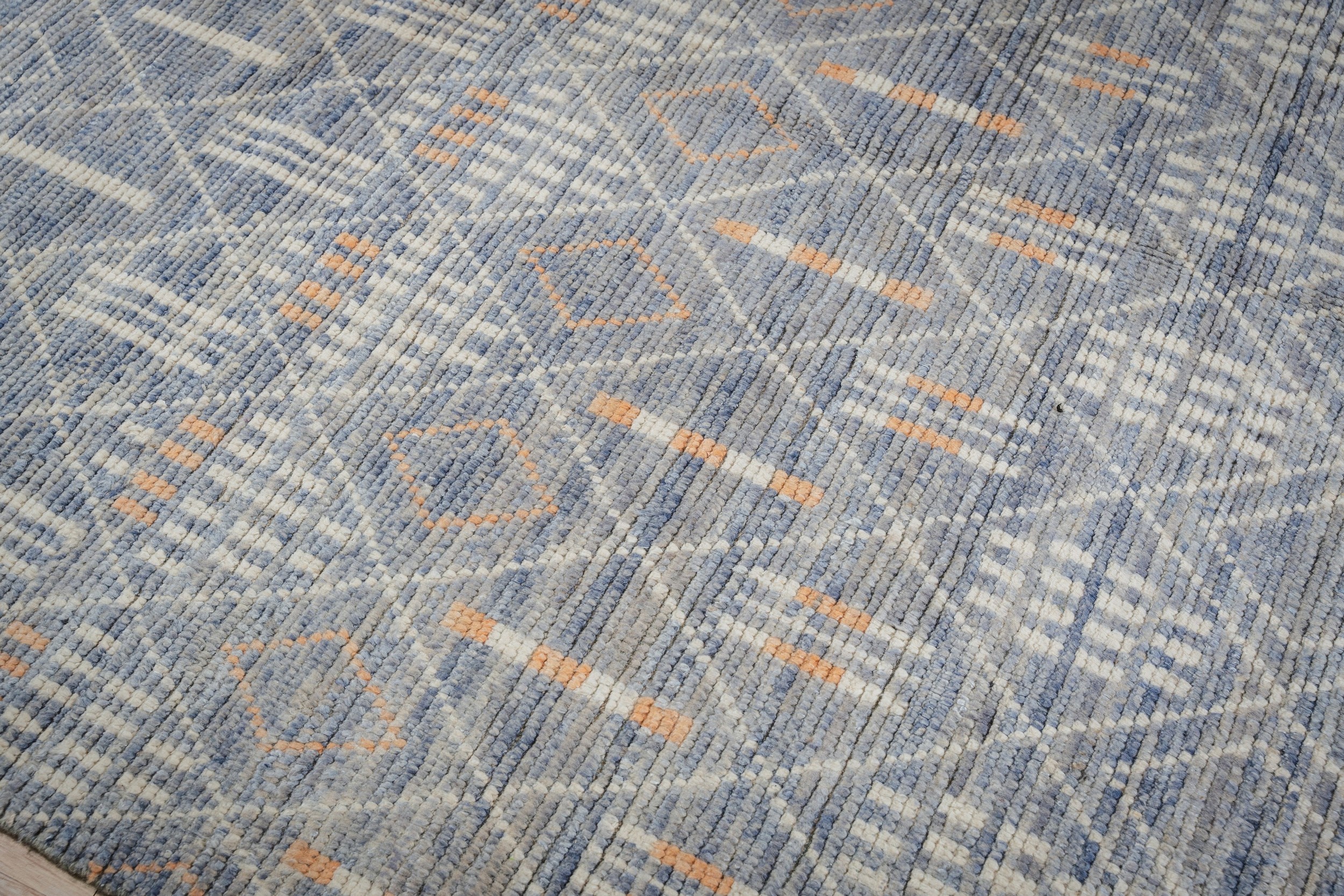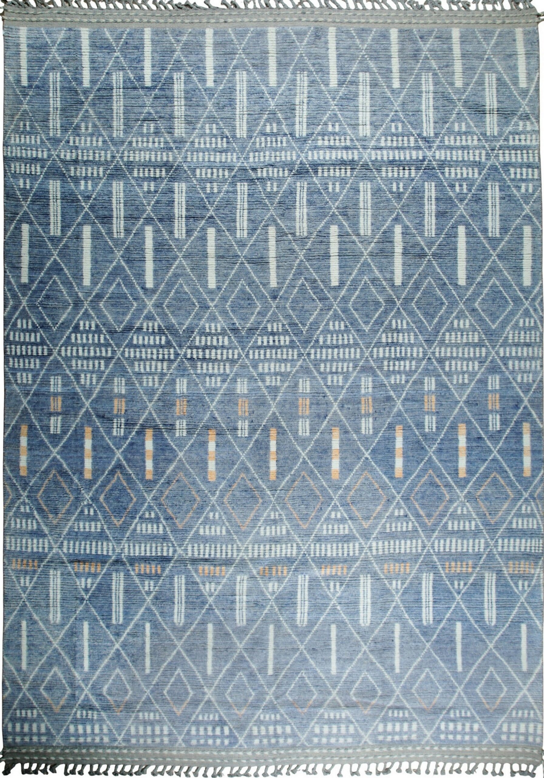 Marrakech Mirage Blue Hand-Knotted Wool Rug, Country of Origin: Pakistan. This striking contemporary piece draws inspiration from traditional tribal motifs while employing a refined, saturated color palette. The production quality reflects the long-standing weaving excellence of Pakistani rugs, known for their durable wool and meticulous knotting techniques.