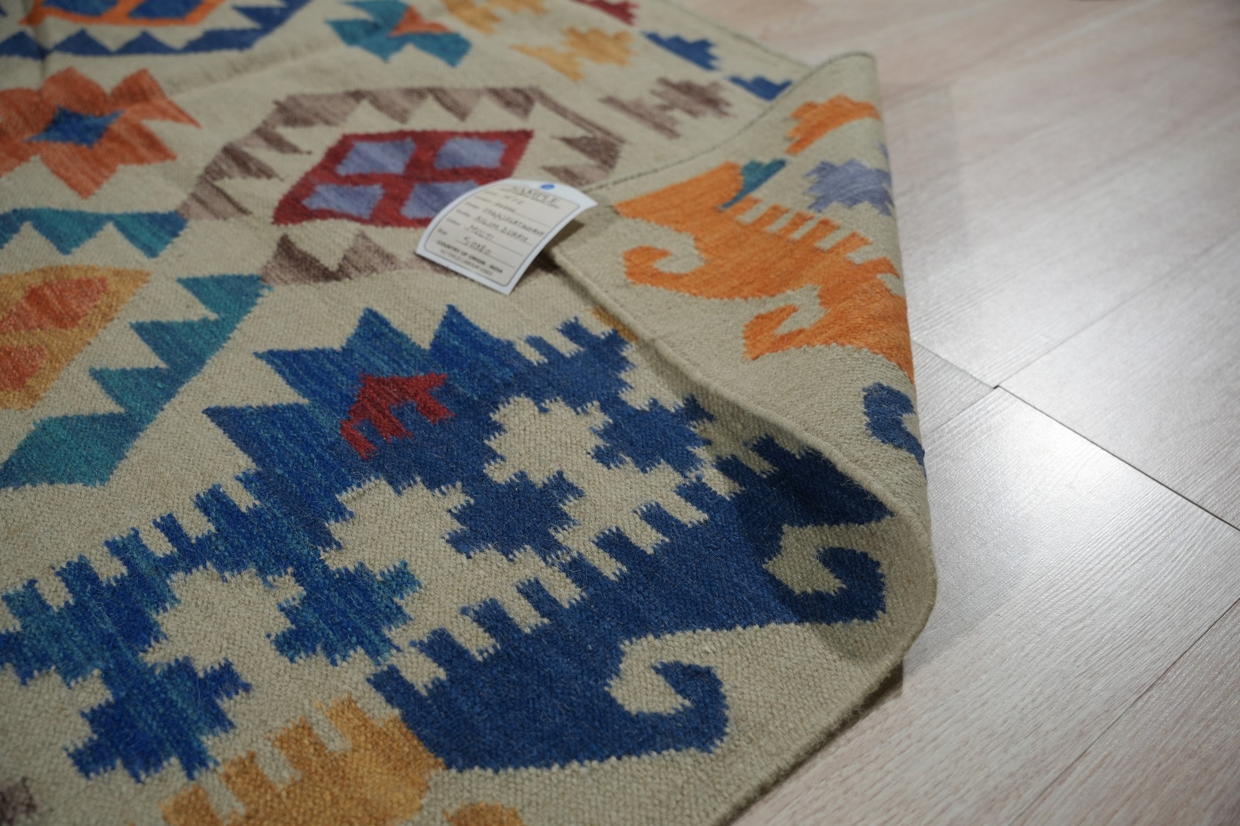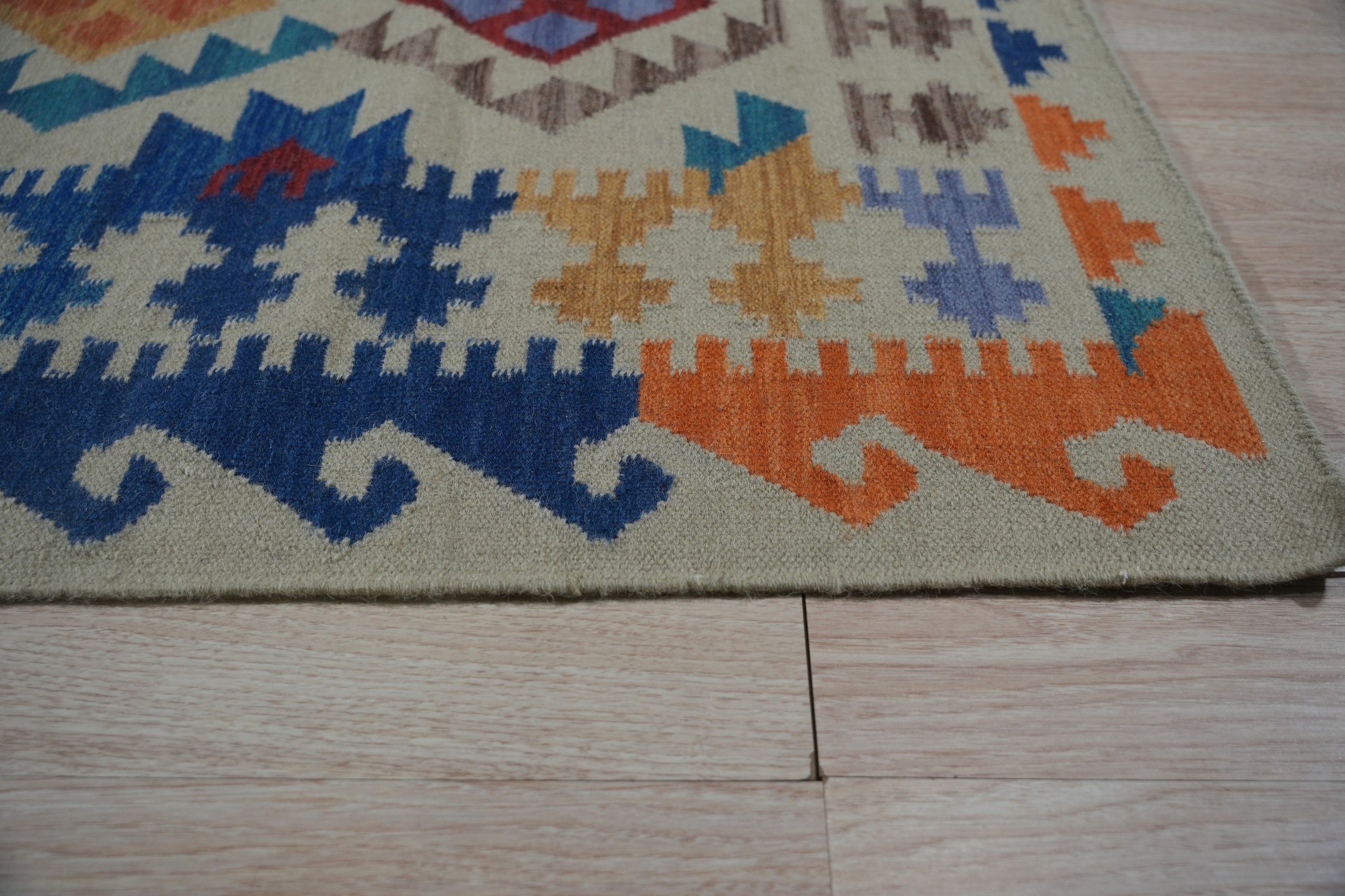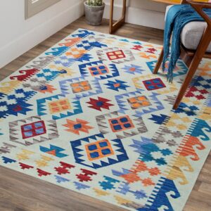 A sophisticated interplay of saturated hues—including cobalt blue, fiery terracotta, and deep saffron—is masterfully balanced against a pale, neutral ground, allowing the complex geometry to truly pop. This piece is part of our curated selection of new area rugs that blend traditional weaving techniques with current design sensibilities.