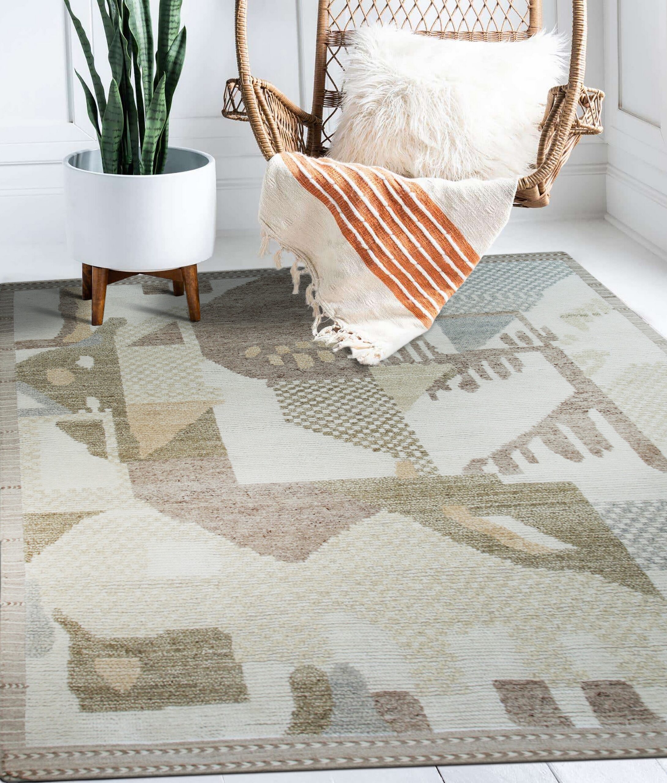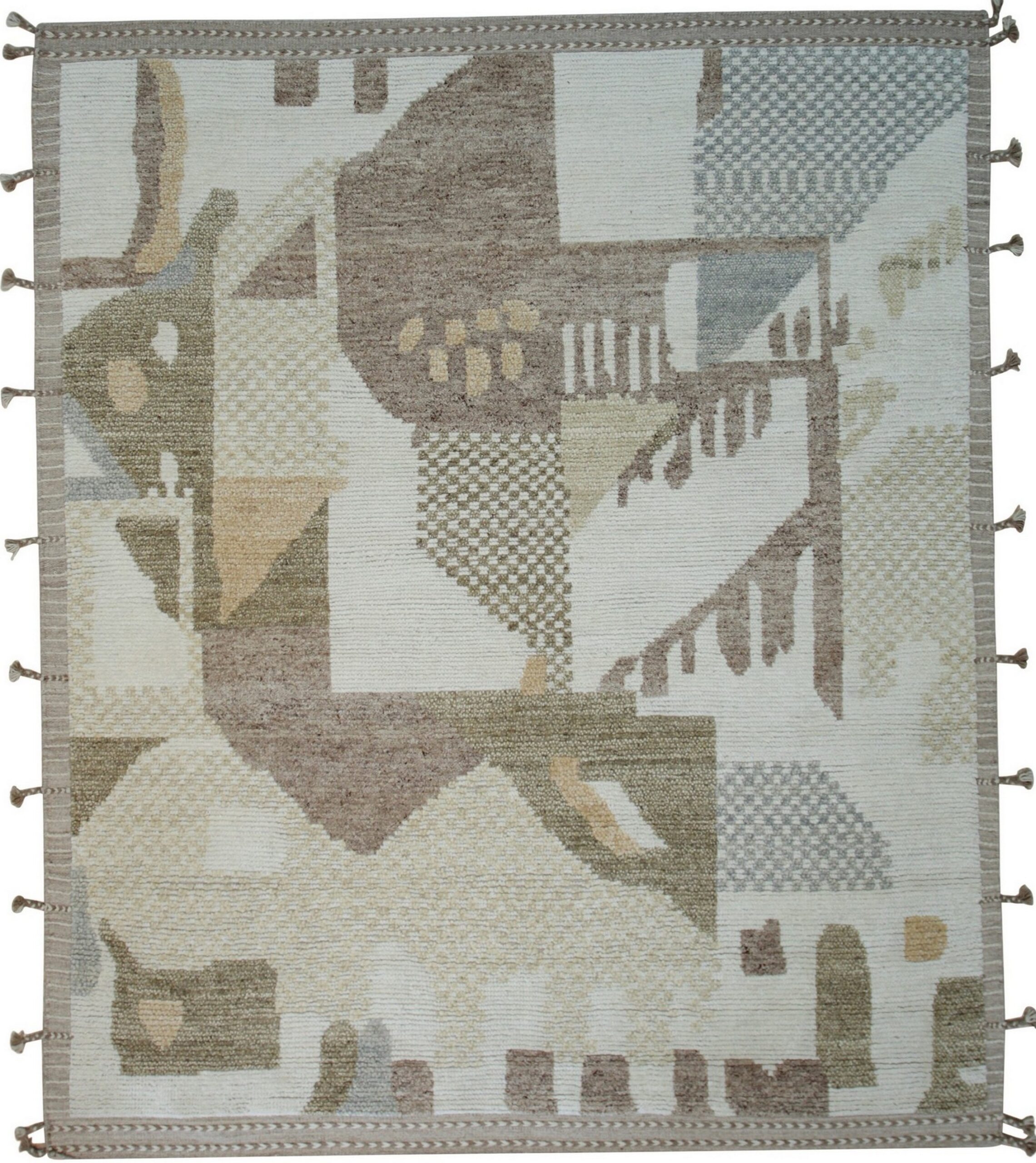 While the title suggests a vibrant spectrum, the Nina rug utilizes a highly refined, muted palette of cream, taupe, sage, and warm brown. This complex interplay of tones, though subdued, achieves the depth and richness characteristic of multicolor jewel tone palettes, allowing the piece to anchor a room without overwhelming existing decor.