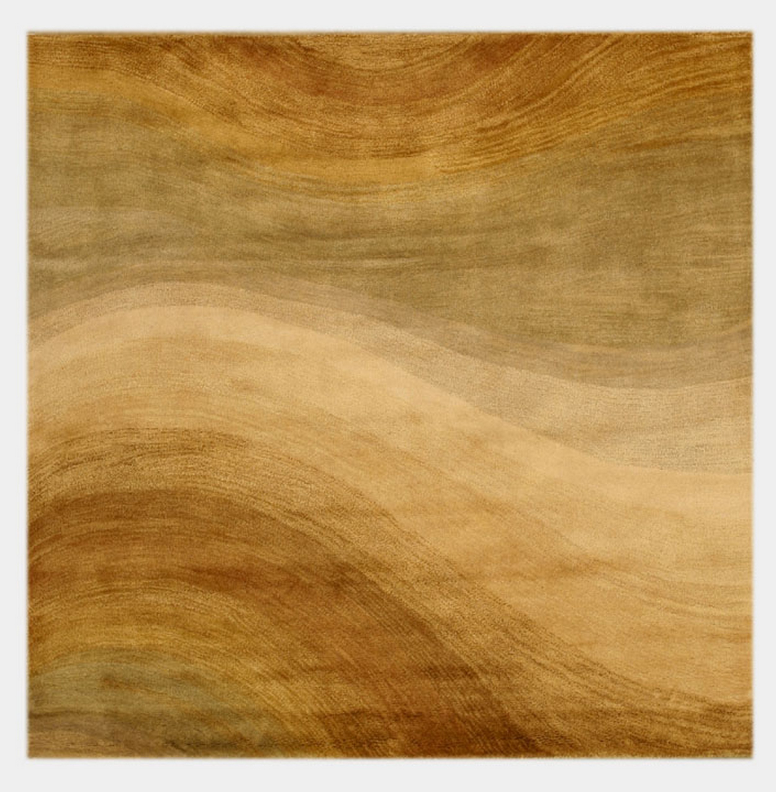 The design is a study in organic abstraction, featuring subtle, horizontal bands that mimic the natural contours of sand dunes or flowing water. The palette is dominated by sophisticated neutrals, blending soft beige tones with rich, earthy shades of gold and yellow. This nuanced color variation creates a dynamic, shifting surface that changes depending on the light and viewing angle.
