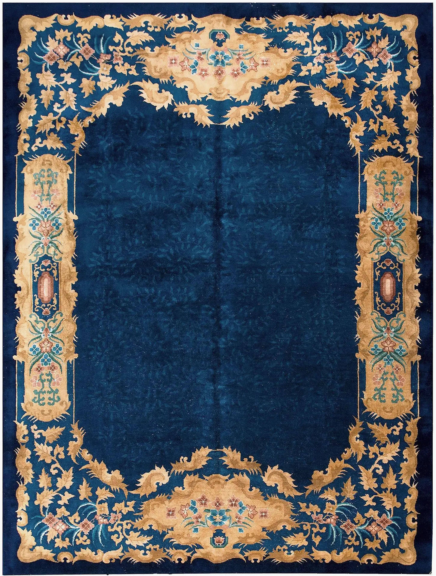 1920s Blue Rectangle Hand Knotted Pile Antique Allover Floral Wool Rug, Circa Date: 1920s. This magnificent piece, hand-knotted from luxurious wool, represents the peak of early 20th-century decorative weaving. The exceptional quality and preservation make it a significant example among antique rugs of the Art Deco era, seamlessly blending traditional craftsmanship with modern scale.