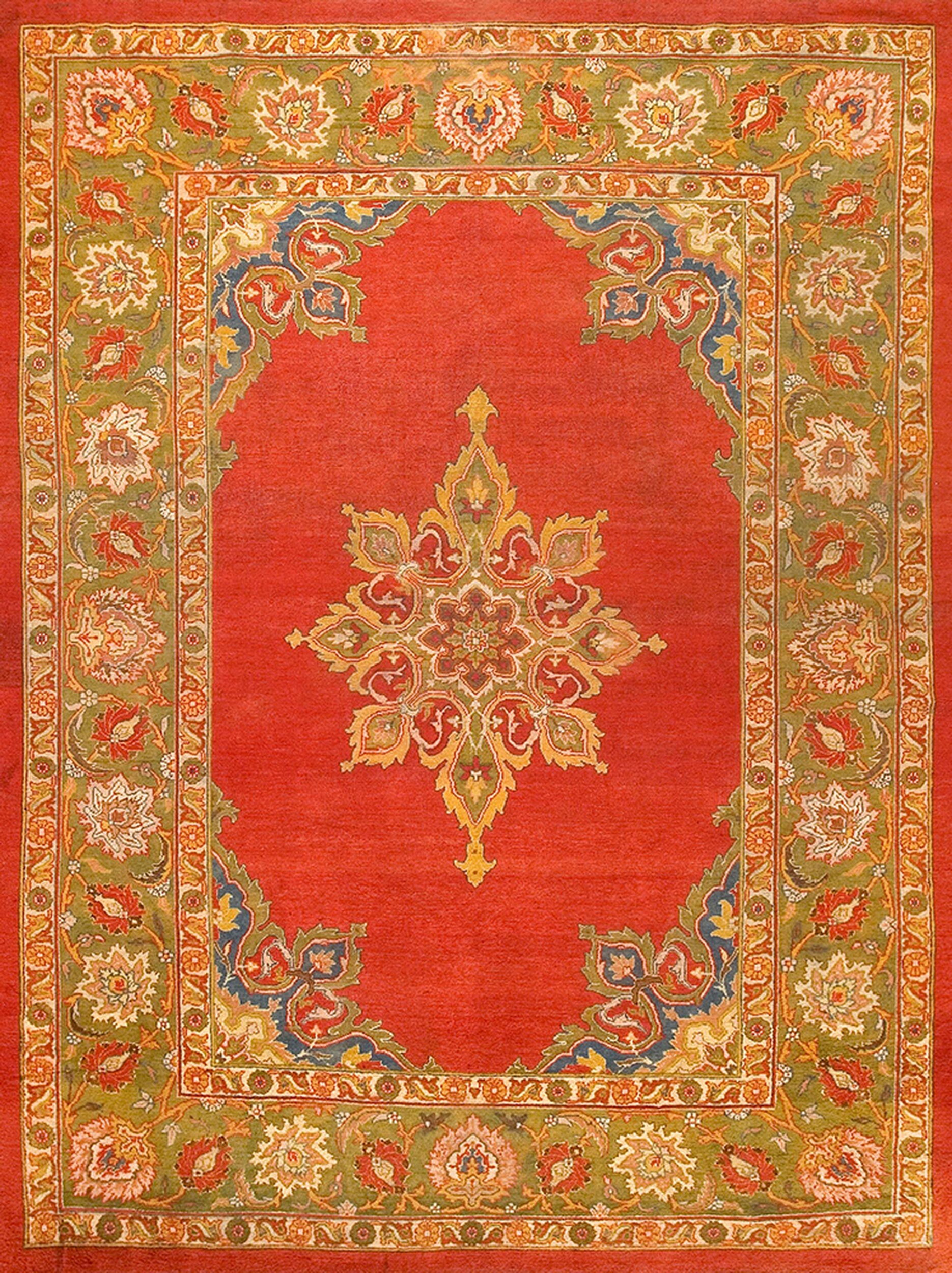 The primary field is dominated by a rich, saturated hue, often described as a vibrant salmon or deep coral color. This intense background provides a dramatic contrast to the border, which utilizes a sophisticated palette of olive greens, pale gold, and touches of deep indigo, lending depth and complexity to the overall design.