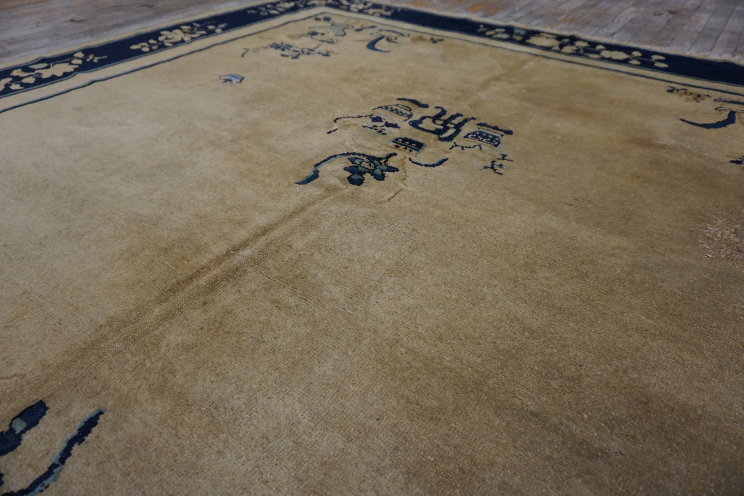 Characteristic of the period, the design features stylized Chinese motifs, including scattered vases and auspicious symbols floating across the open field. The primary border showcases a delicate scrolling vine pattern, emphasizing the inherent elegance found in floral rugs of this era.