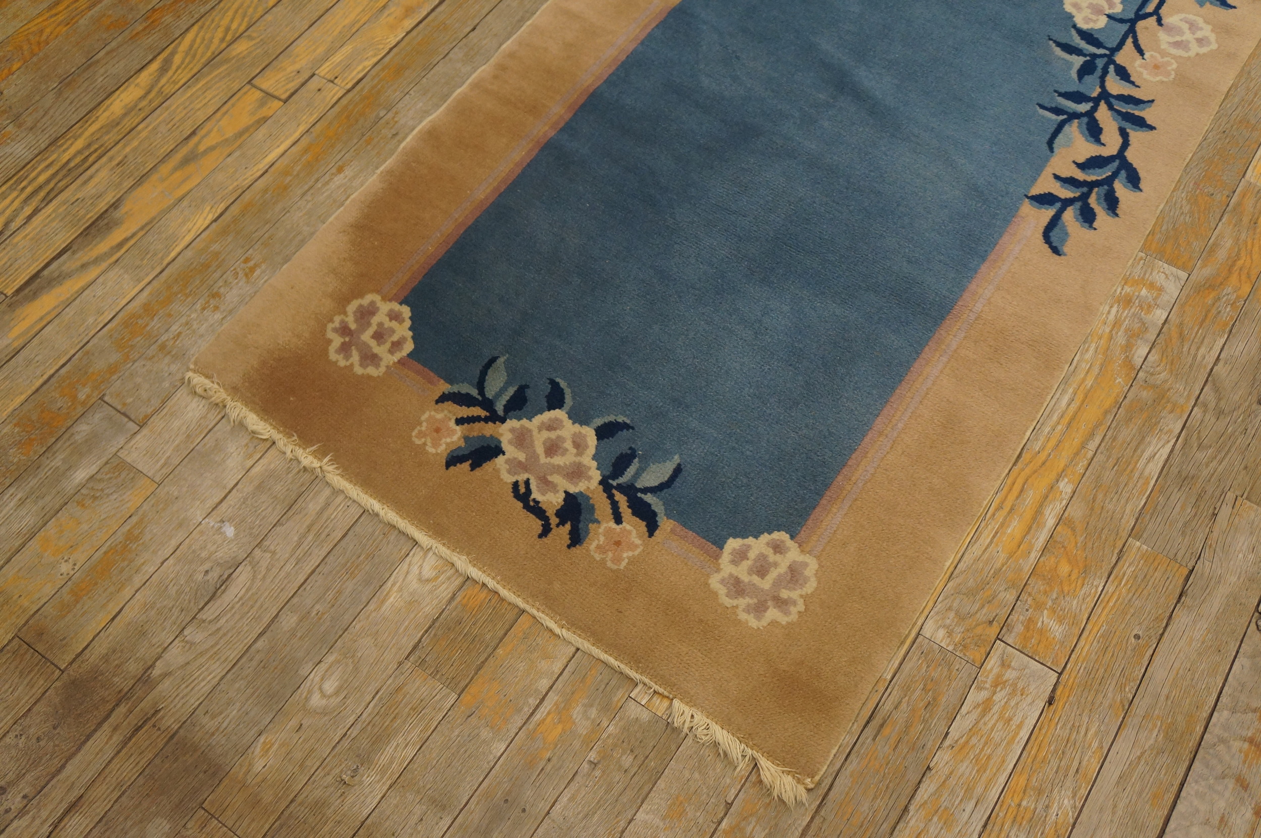 Along the inner and outer edges, stylized blossoms—likely peonies or chrysanthemums—are rendered in subtle shades of cream and pale mauve. These blossoms are connected by deep indigo vines, showcasing the classic Chinese appreciation for floral rugs while maintaining the minimalist sensibilities of the Art Deco era.