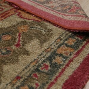 The expansive central field is defined by a saturated, almost wine-dark crimson, beautifully offset by a complex border palette of muted sage, olive, and ochre. This careful juxtaposition of jewel tones against earthier hues creates a warm, inviting presence. The primary tone is a deep, sophisticated red, bordering on the richer end of salmon and coral.