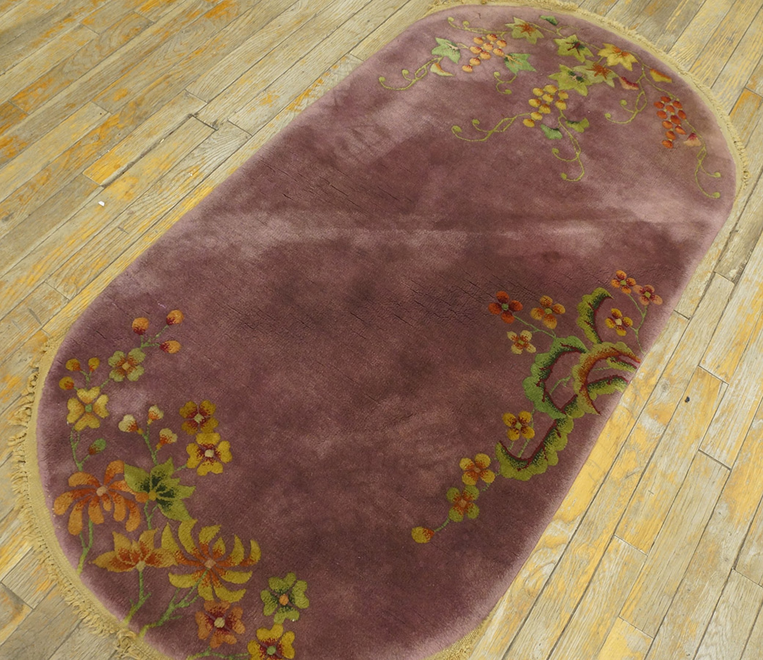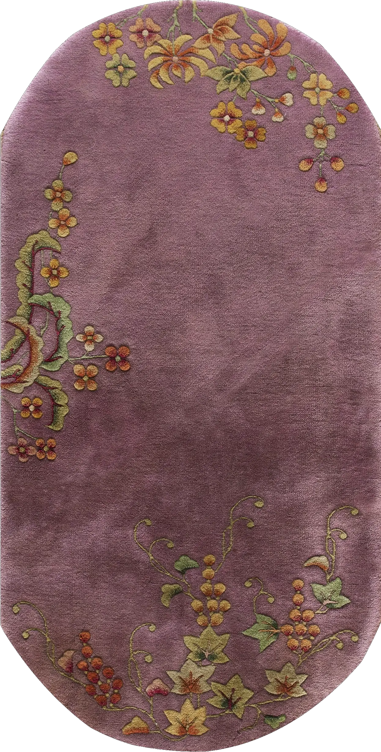 The expansive field is rendered in a deep, muted mauve, providing a luxurious and velvety backdrop for the stylized botanical elements. This particular shade of purple color rugs was highly fashionable during the Jazz Age, reflecting a move away from traditional Chinese imperial palettes toward Western modernist tastes.
