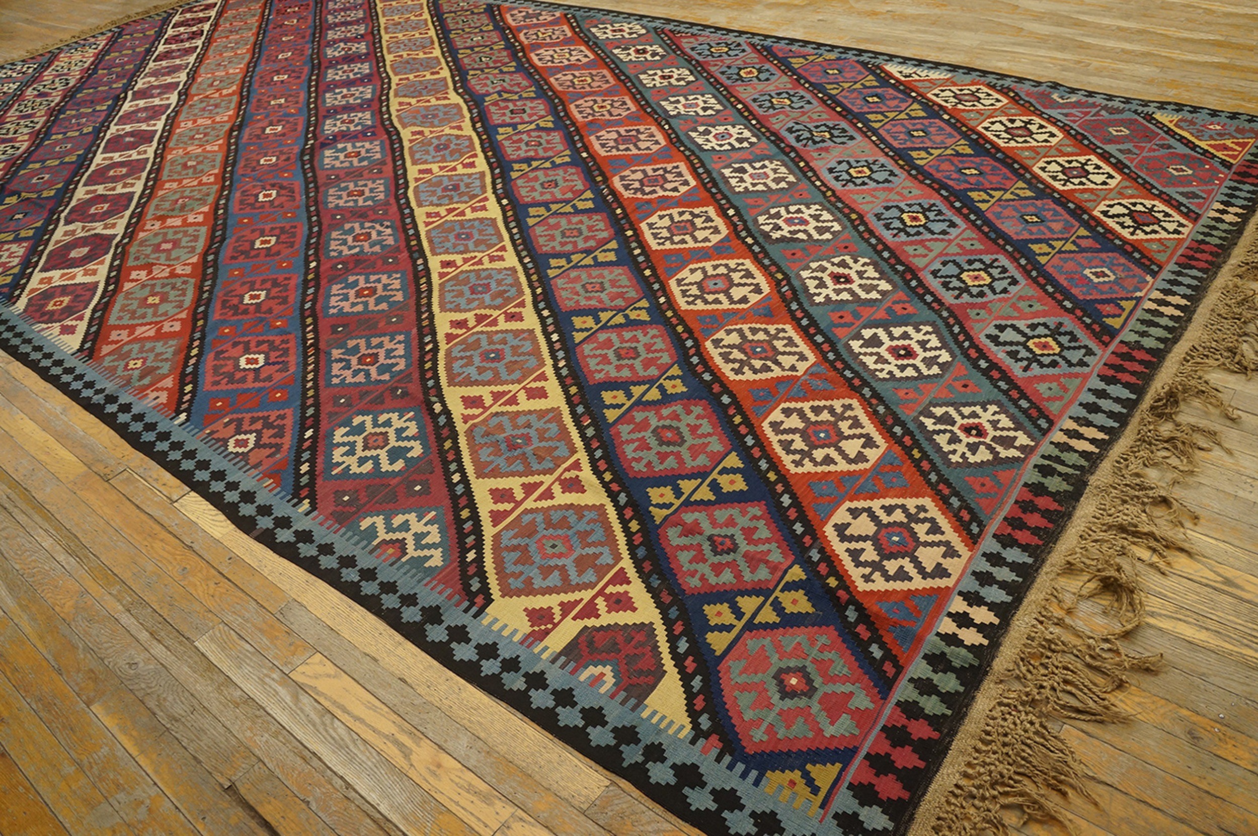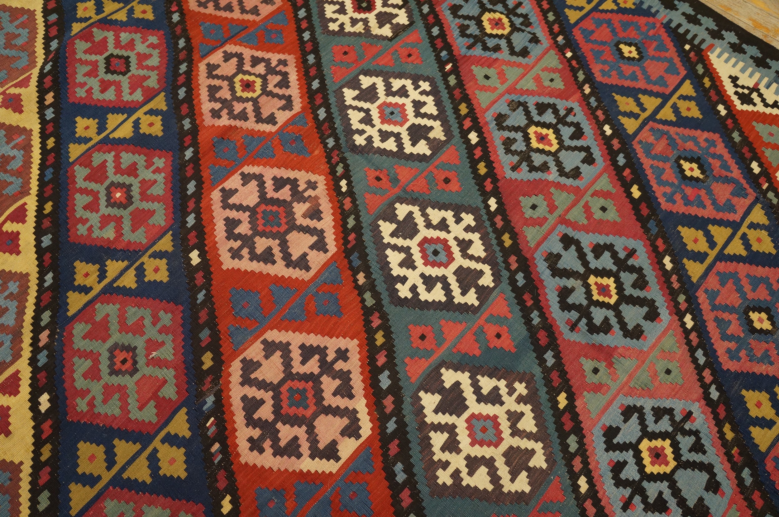 This flatwoven monumental oversized tribal antique Caucasian rug, dating to the late nineteenth century, is a breathtaking example of the tribal geometric tradition that flourished in the rugged mountains between the Black and Caspian Seas. Historically, Caucasian flatwoven kilims were the soul of the nomadic lifestyle, serving as versatile architectural elements that functioned as floor coverings, wall hangings, and room dividers. While most kilims from this region were produced in narrow, portable formats, this “oversized” specimen represents a significant technical achievement, likely woven on a grand horizontal loom for a high-status tribal chieftain or as a prestigious dowry commission intended for a communal gathering space.