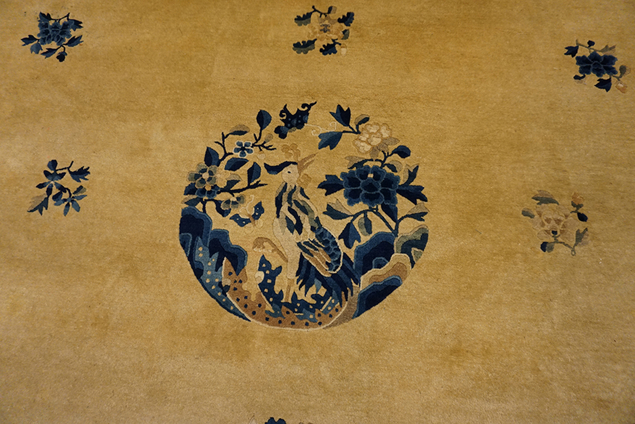 At the heart of each rug lies a finely drawn central medallion pattern — a compositional device drawn from traditional Oriental design that, here, is infused with an airy poise and subtle symbolism. Surrounding this centerpiece, botanical elements and avian figures appear to float freely across the spacious ground, creating a rhythmic interplay between positive form and open space that is characteristic of high-end Peking carpets from the Republican Era.