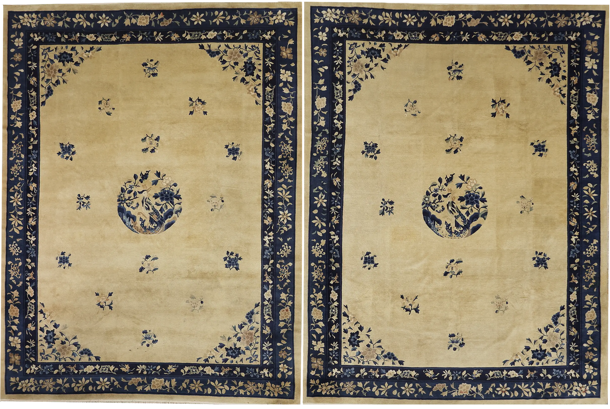 Evoking the refined sensibilities of early 20th-century antique Chinese carpets artistry, this exceptional pair of antique Peking rugs from China exemplifies the serene elegance that made Peking weaving a distinguished export tradition during the 1920s. Originating from China and expertly hand-knotted in lustrous wool, these room-size works (approximately 9′ × 12′ each) present a luminous cream and ivory field that serves as a stage for delicately articulated motifs of floral sprays, graceful birds, and central medallions — imagery that resonates with classical Chinese aesthetics while retaining universal decorative appeal.