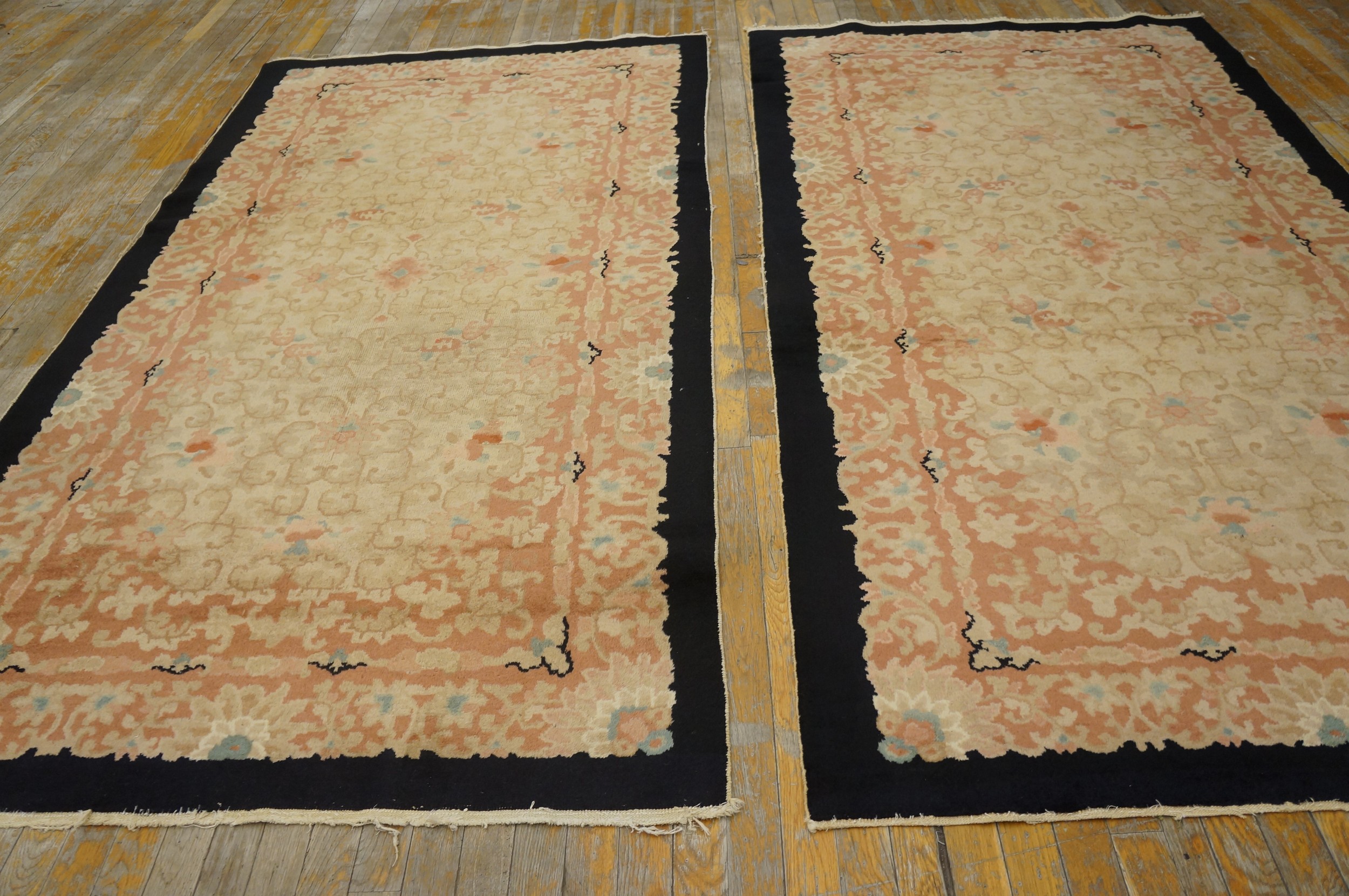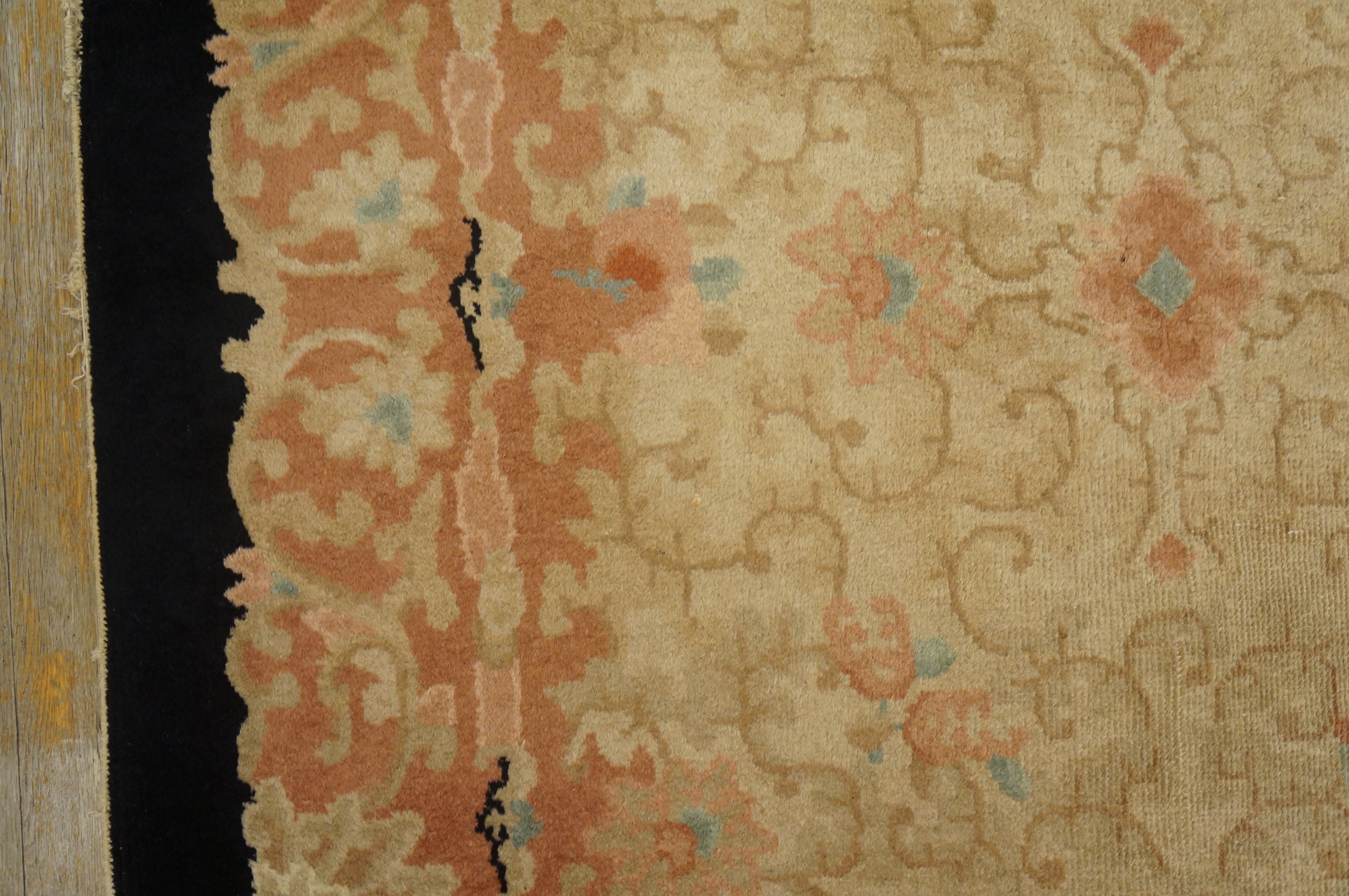 A rich, rust-toned border frames the central design, utilizing a complementary scrolling pattern that provides definition without harsh contrast. The edges are notably scalloped, a charming detail that softens the rug’s silhouette and enhances its handcrafted appeal. This careful attention to outline is characteristic of high-quality Chinese production from the Republican era.