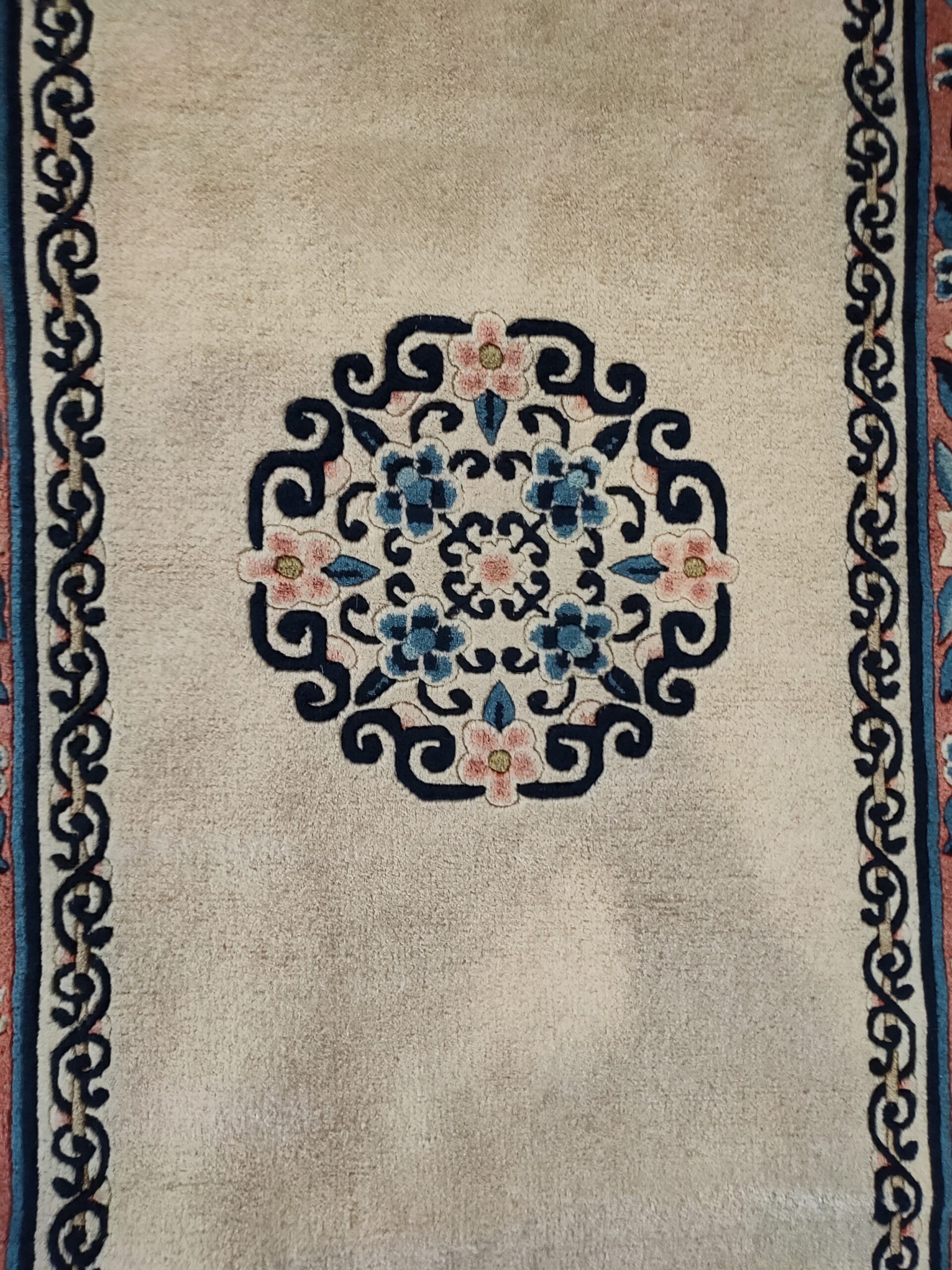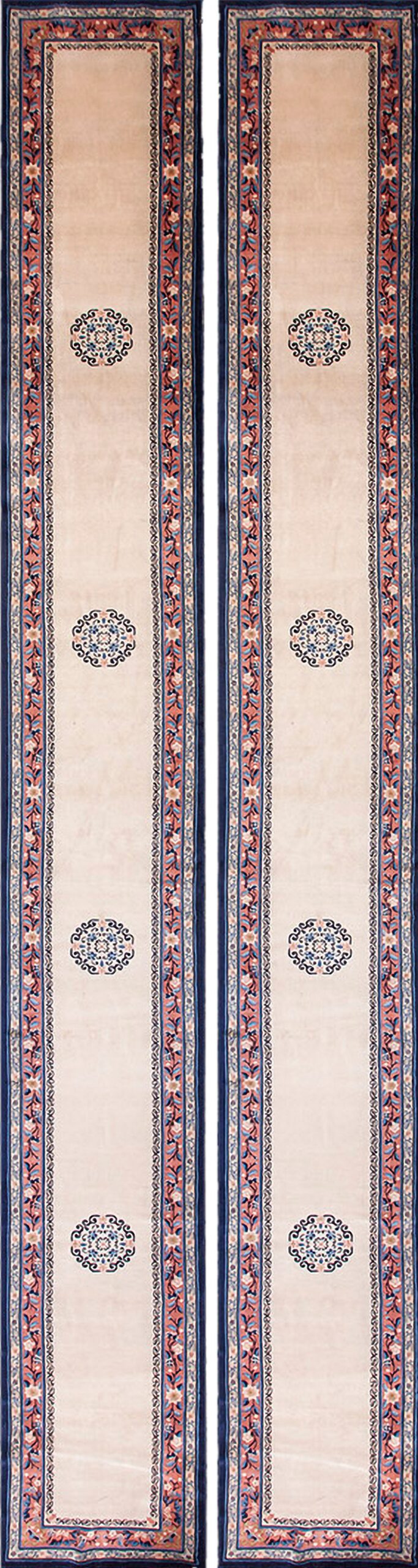 The borders act as a disciplined architectural frame, often featuring a solid-color band or a simple “T-fret” design to provide a sense of structural “lock” for the ethereal field. To possess this pair of vintage Peking ivory background color wool pile runners rugs woven in China is to own a rare set of architectural accents. They bridge the gap between traditional Eastern motifs and modern minimalist requirements—transforming a transitional hallway into a gallery of historical soul and serene, ivory-toned grace.