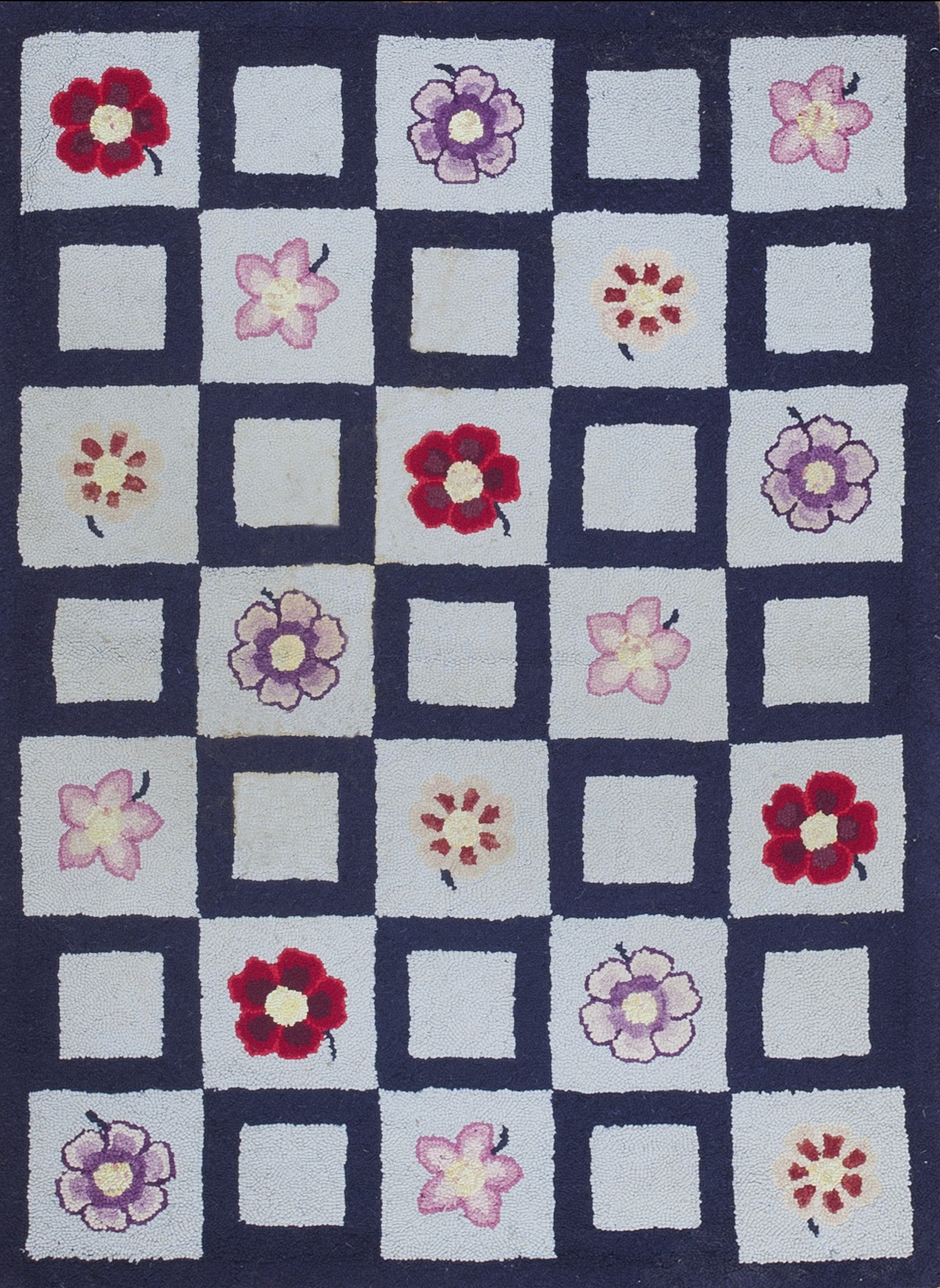 This early 20th-century Antique American Hooked Rug is a sophisticated example of geometric folk art, showcasing the timeless appeal of the checkerboard design. While many antique American folk art design hooked rugs of this era featured complex floral or pictorial narratives, this specimen embraces a clean, rhythmic symmetry that feels remarkably modern. The checkerboard pattern is a classic motif in American folk tradition, representing a disciplined yet charming approach to domestic textile creation.
