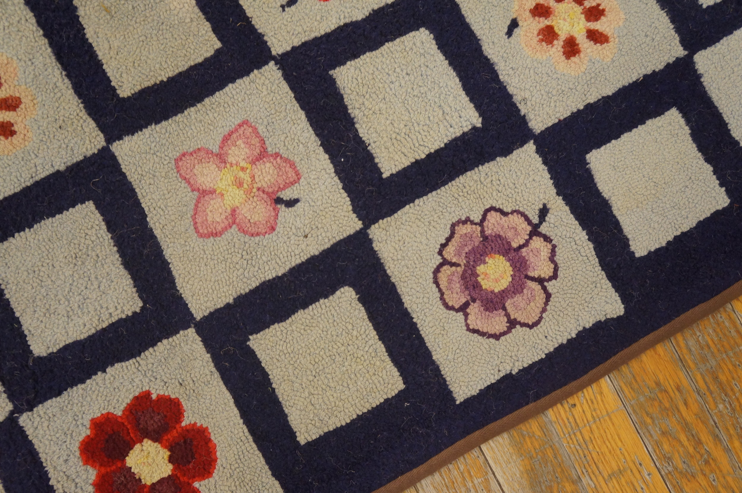 The composition is centered upon a Minimalist Geometric layout, featuring a series of alternating squares that create a balanced and continuous visual flow. The “drawing” is defined by the soft, hand-hooked edges of the squares, which prevent the pattern from feeling overly rigid or industrial. This artisanal irregularity is the hallmark of authentic Americana, giving the folk art design rug a soulful, “lived-in” character that distinguishes it from modern machine-made reproductions. The repetitive nature of the grid makes this rug an excellent choice for adding structure to a room without overwhelming other design elements.