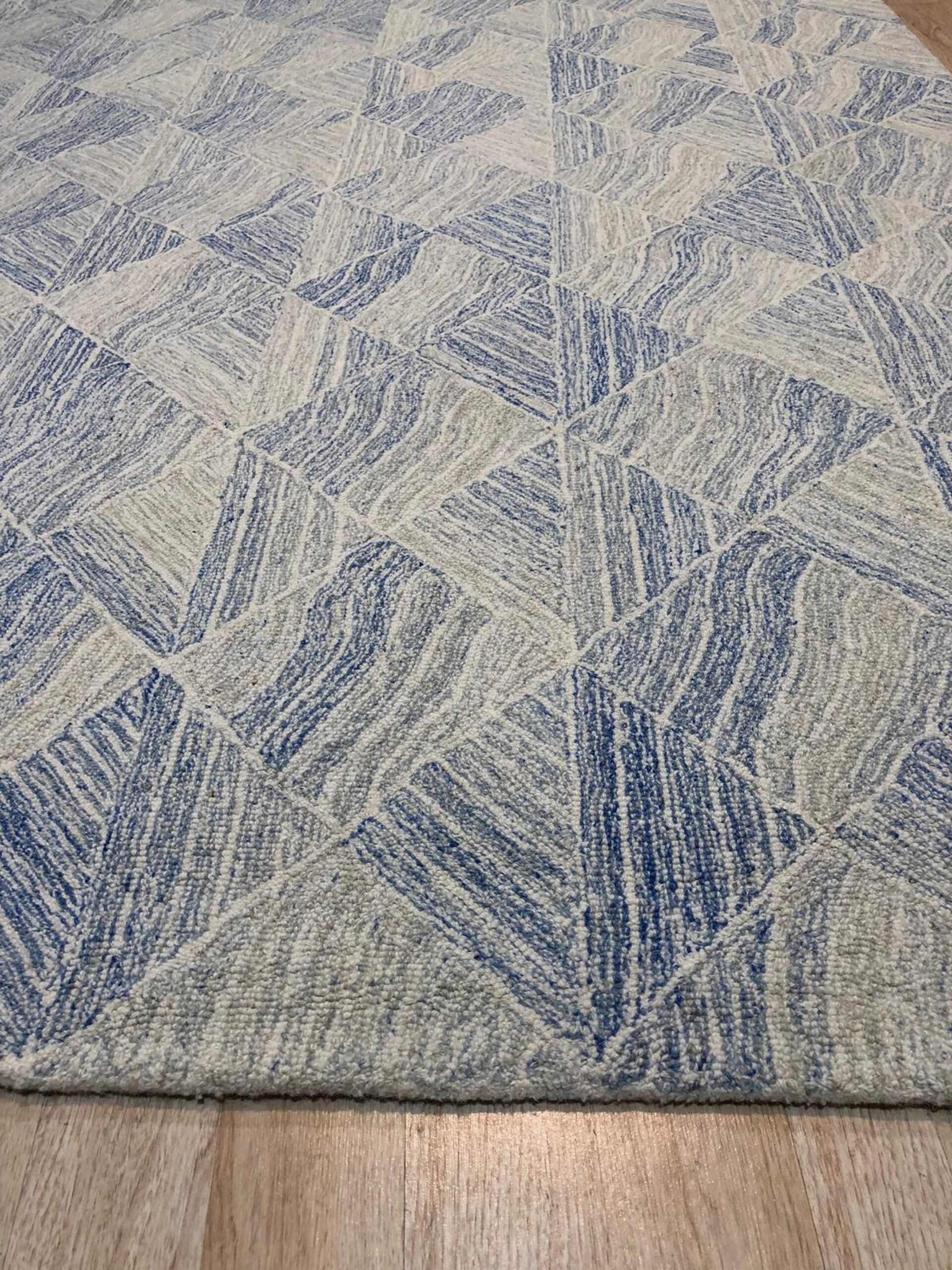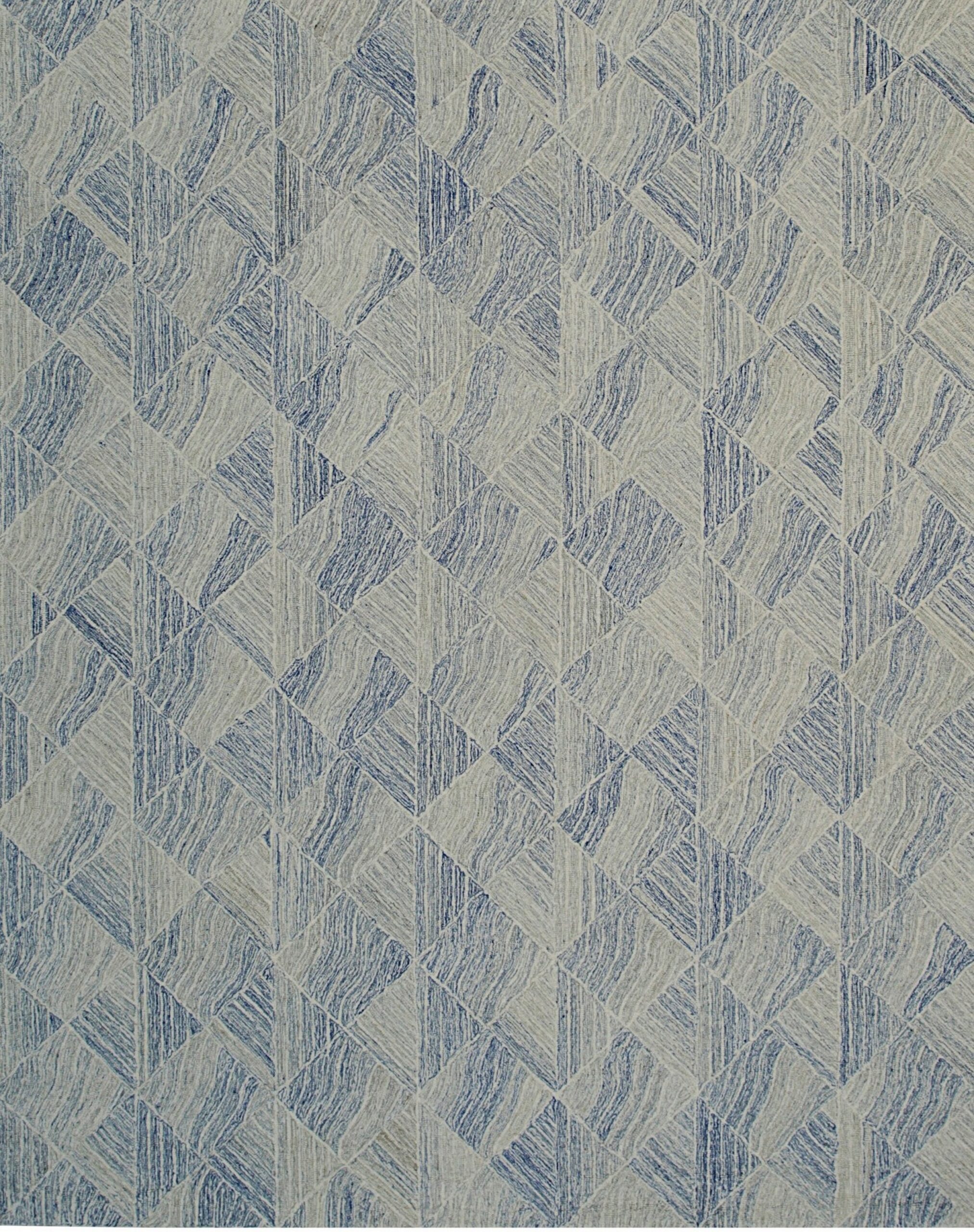 Para Nadia Blue Hand Tufted Wool Rug, Country of Origin: India. This contemporary piece reinterprets classic geometric structure through a modern lens, offering a dynamic visual texture achieved by varying the direction of the wool pile within each quadrant. The fine craftsmanship inherent in Indian rugs is evident in the precise execution of the repeating diamond motif.