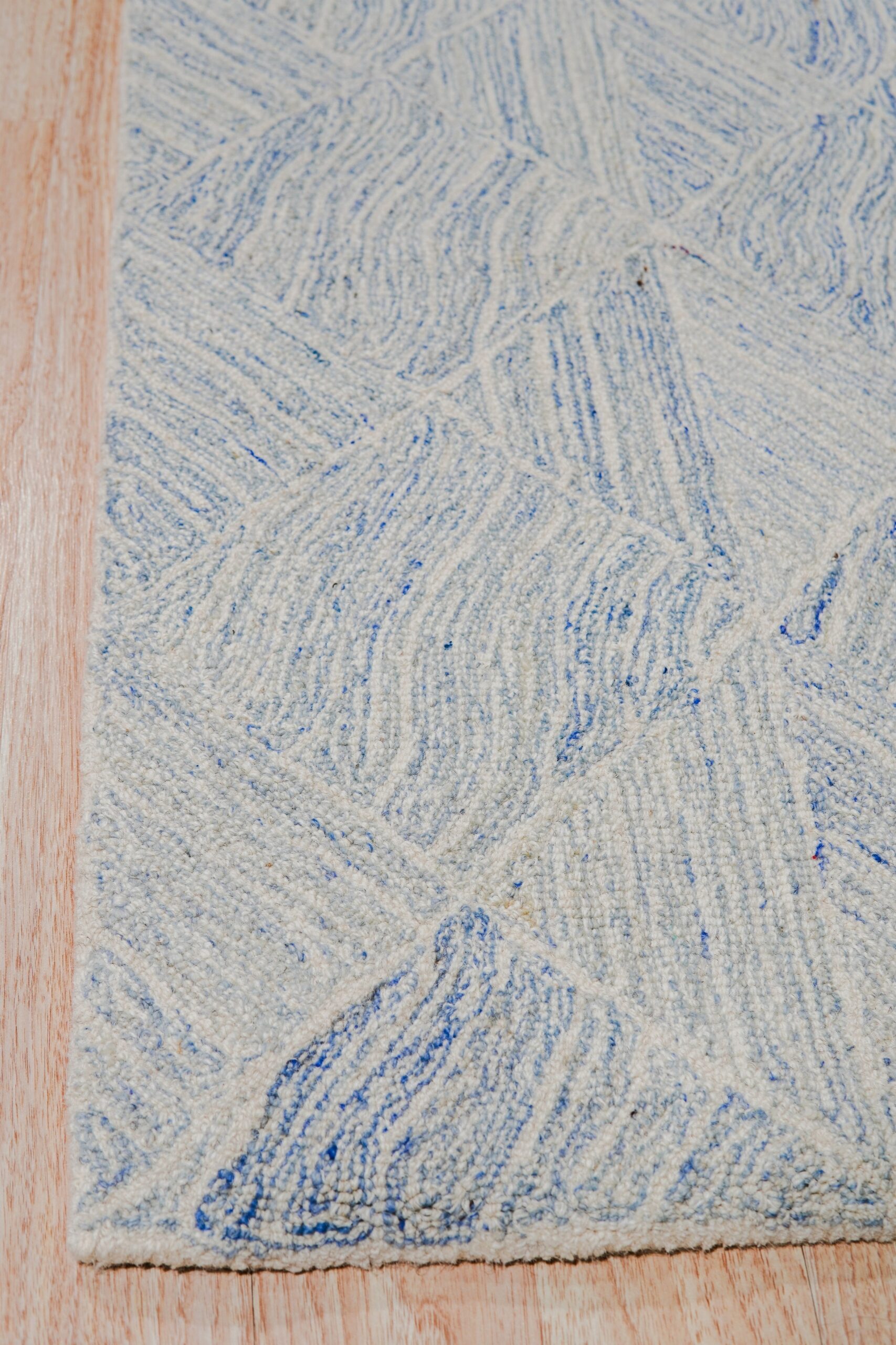 The palette features deep denim blues interwoven with soft, cloud-like greys, creating a subtle, shifting surface quality that catches the light differently depending on the viewing angle. While the tones are restrained, the complex interplay of shades qualifies this piece among our sophisticated multicolor jewel tone rugs, providing necessary depth without overwhelming the surrounding décor.