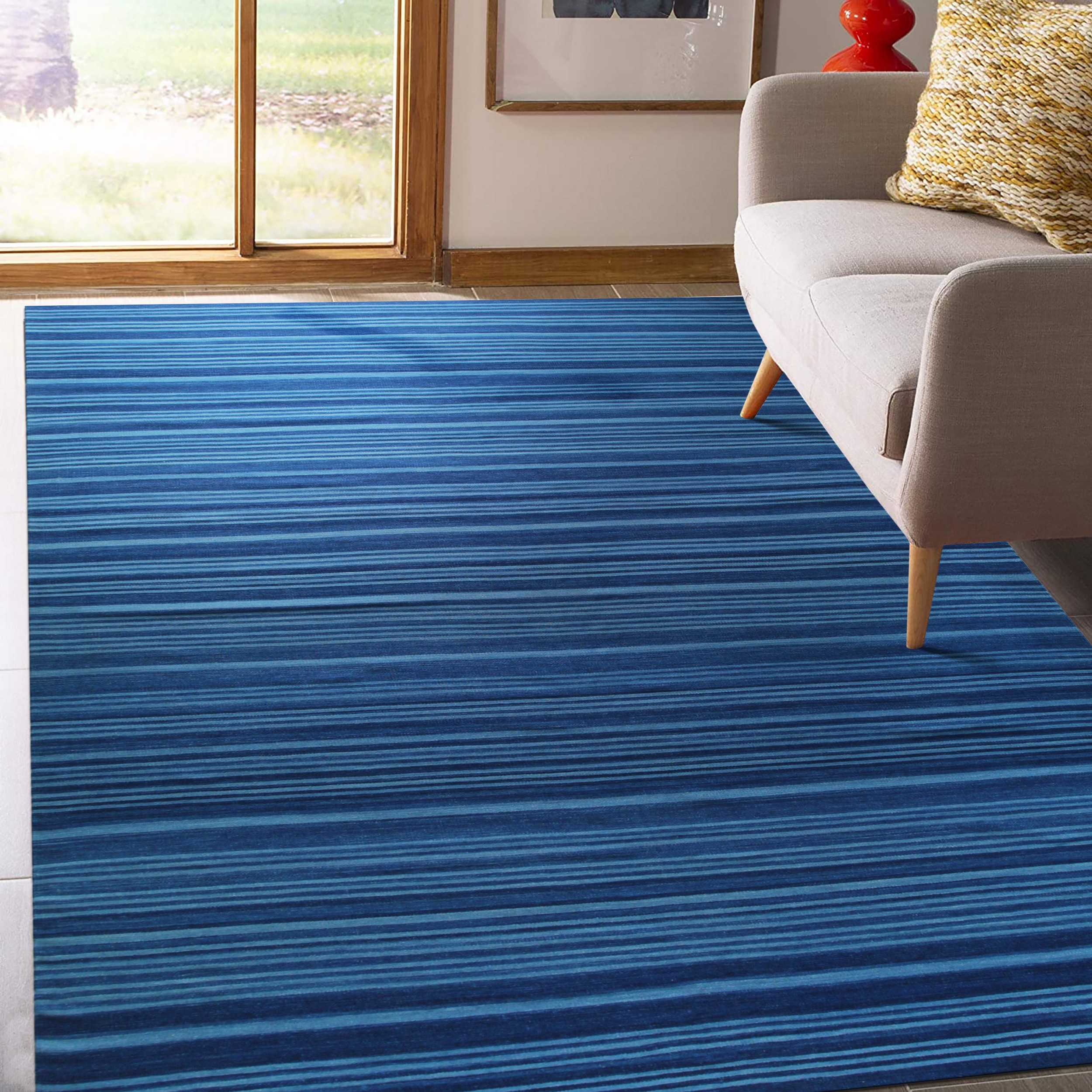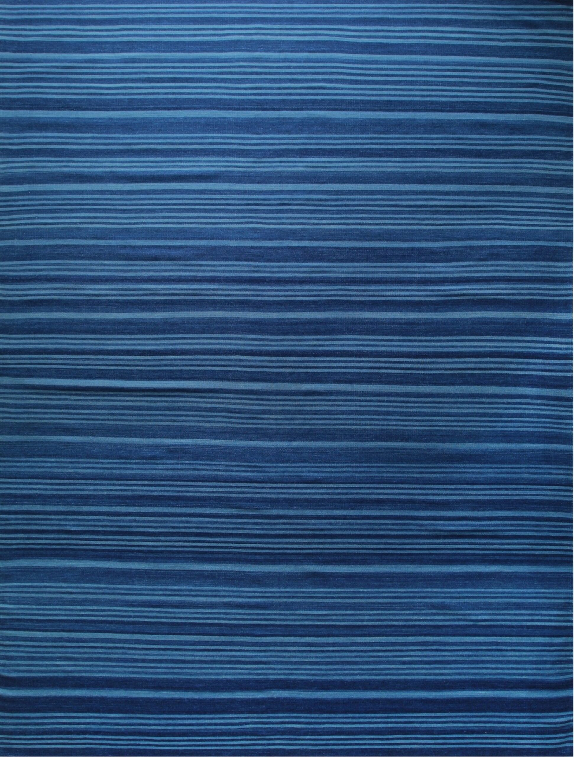The design is deceptively simple, featuring horizontal bands of varying thickness and saturation. The rich indigo and cerulean tones create a dynamic visual rhythm, making this a standout example among blue color rugs. This nuanced use of color ensures the rug remains sophisticated rather than stark, offering a calming yet compelling foundation for any room setting.