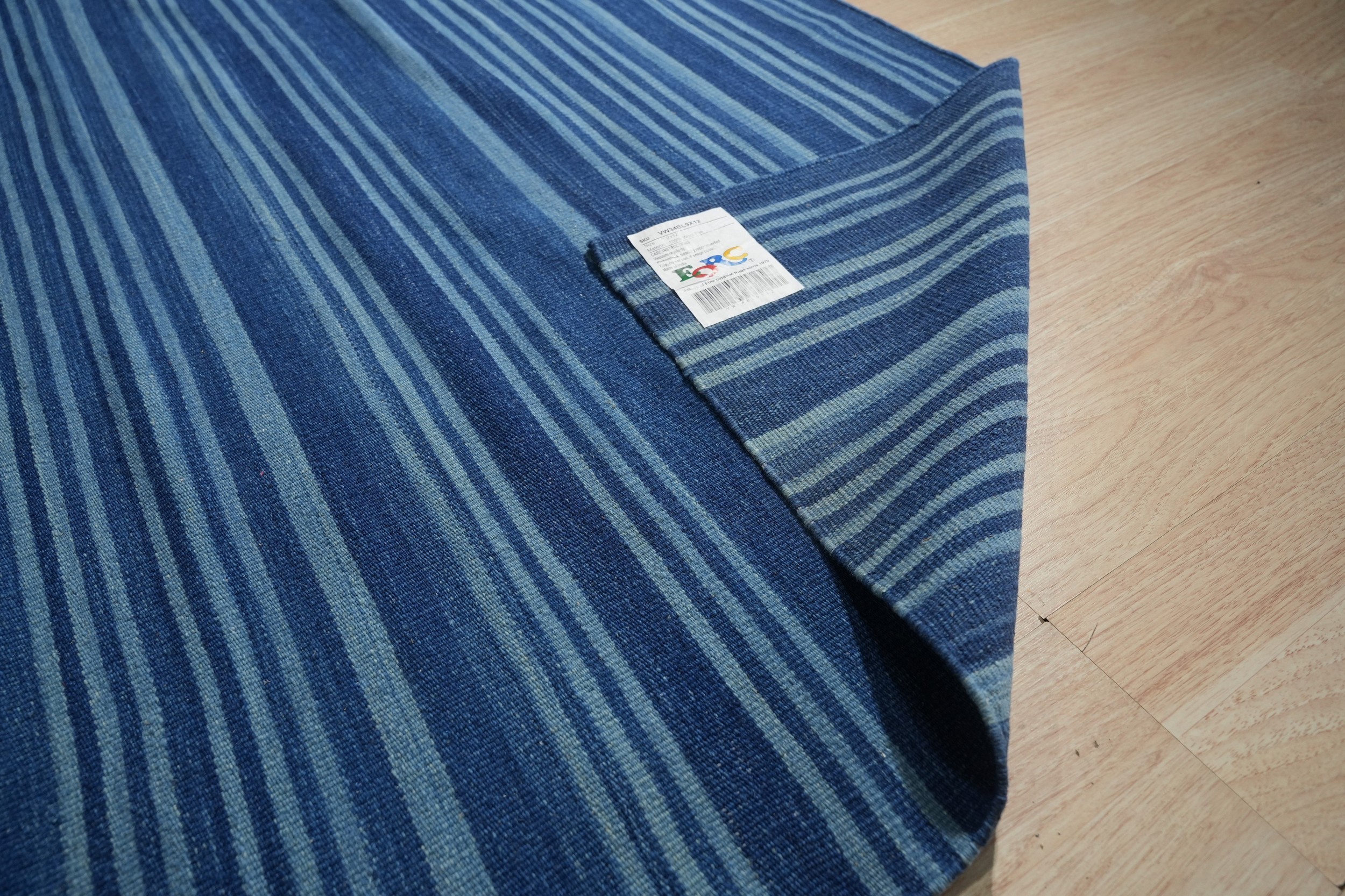 Para Penelope Blue Flatweave Wool Rug, Country of Origin: India. This contemporary piece offers a striking study in color gradation and texture. Woven using traditional techniques, this flatweave structure is characteristic of fine Indian rugs, providing durability and a sleek profile ideal for modern interiors.