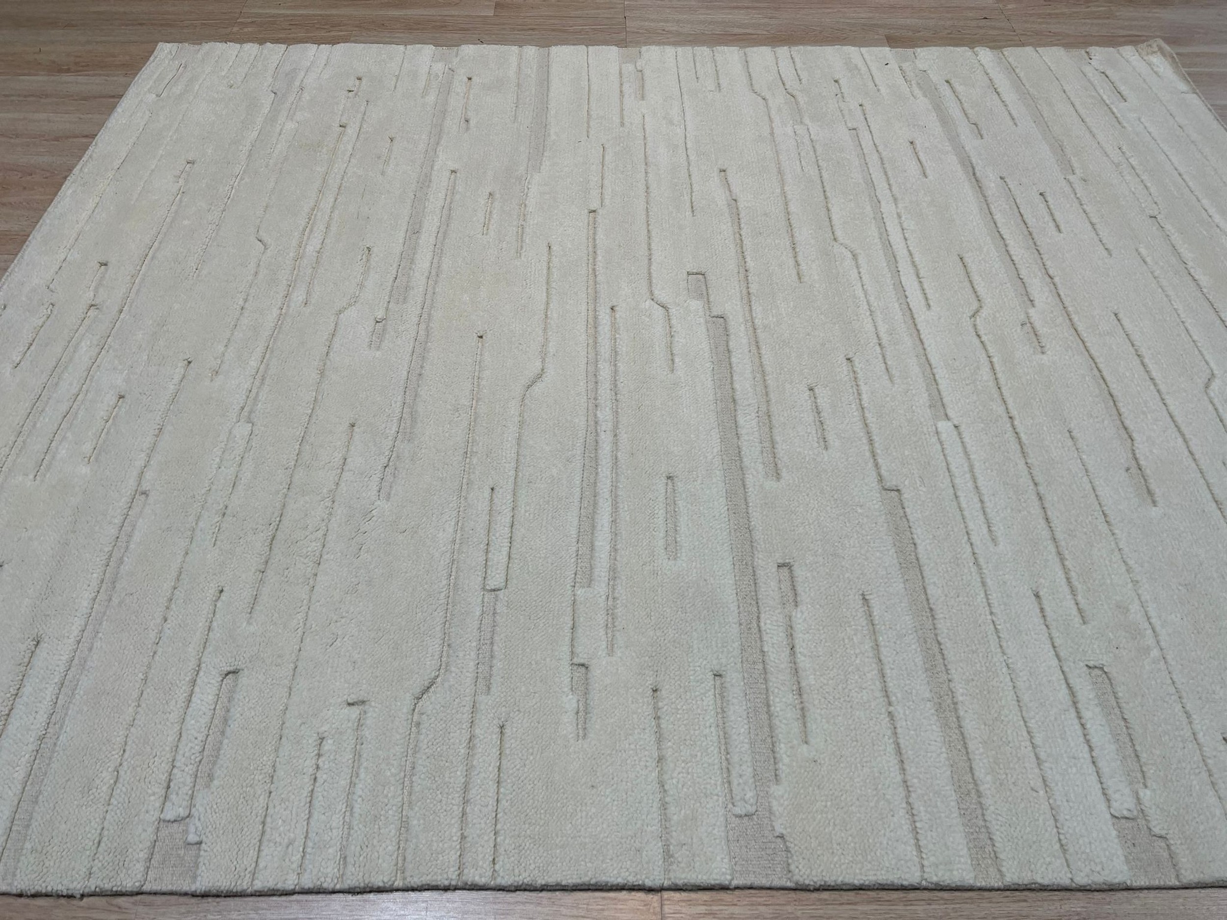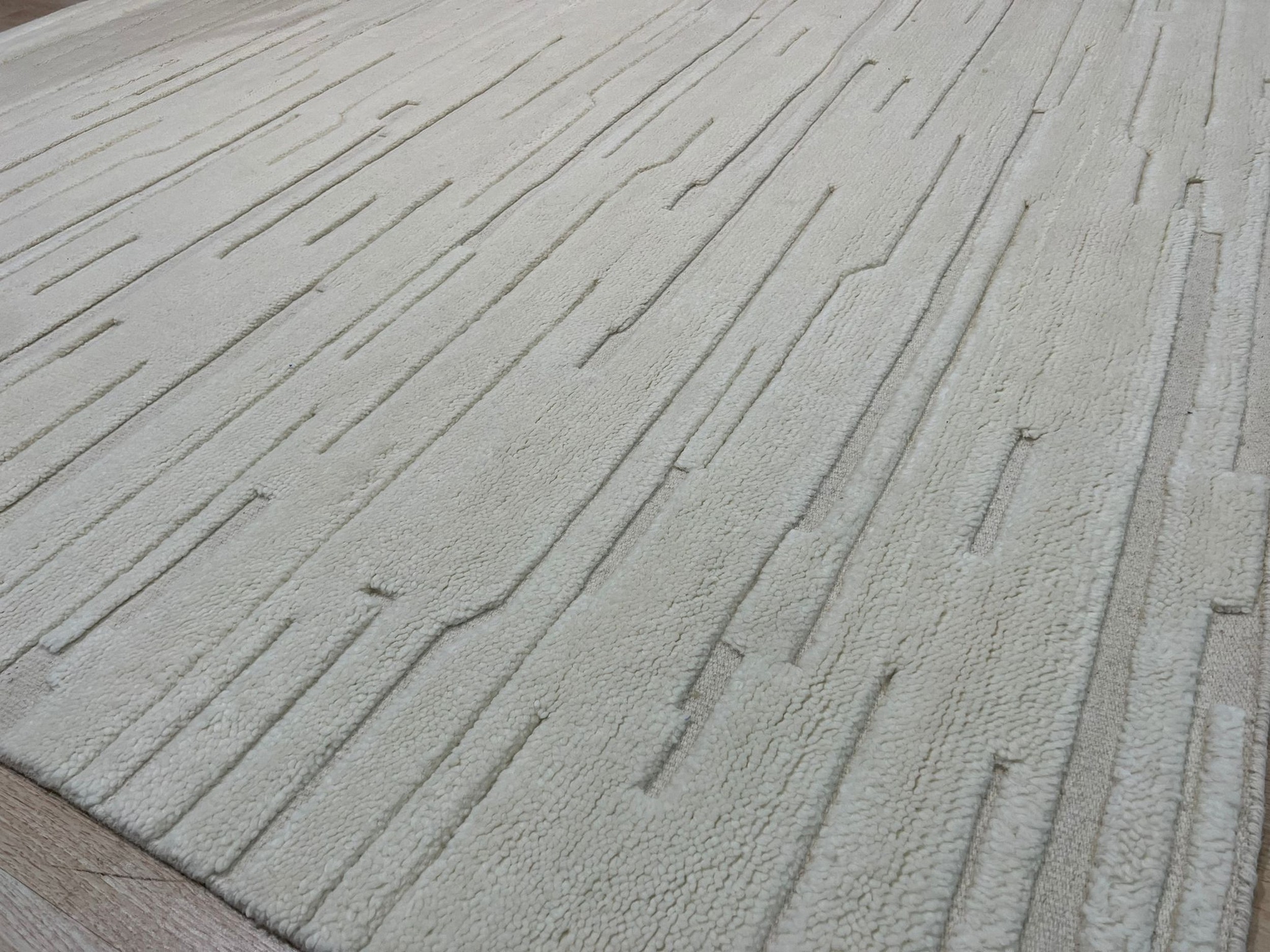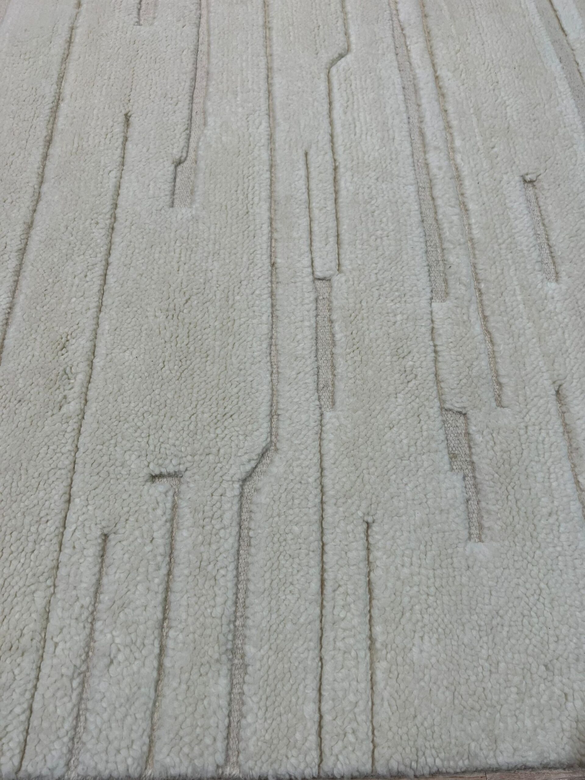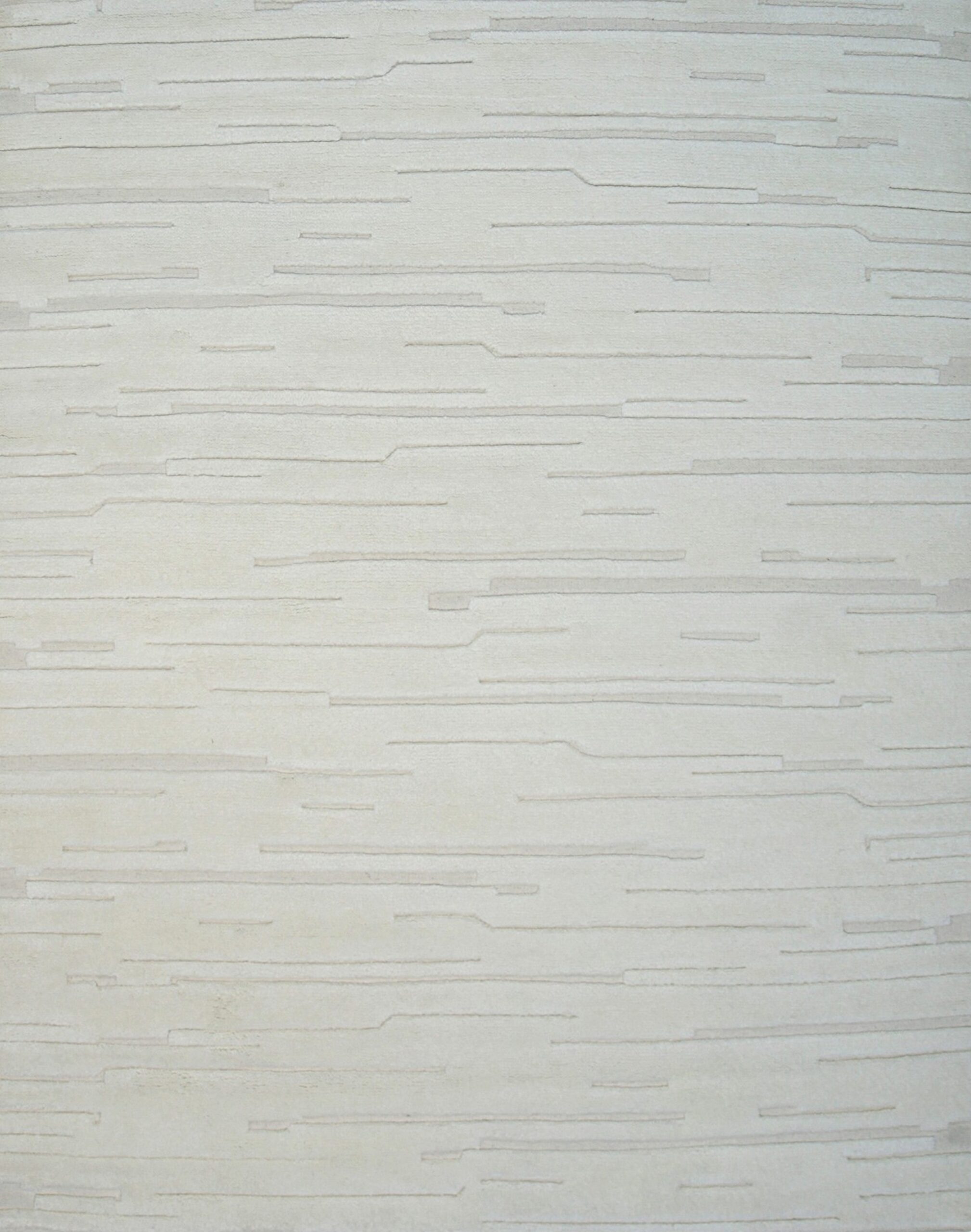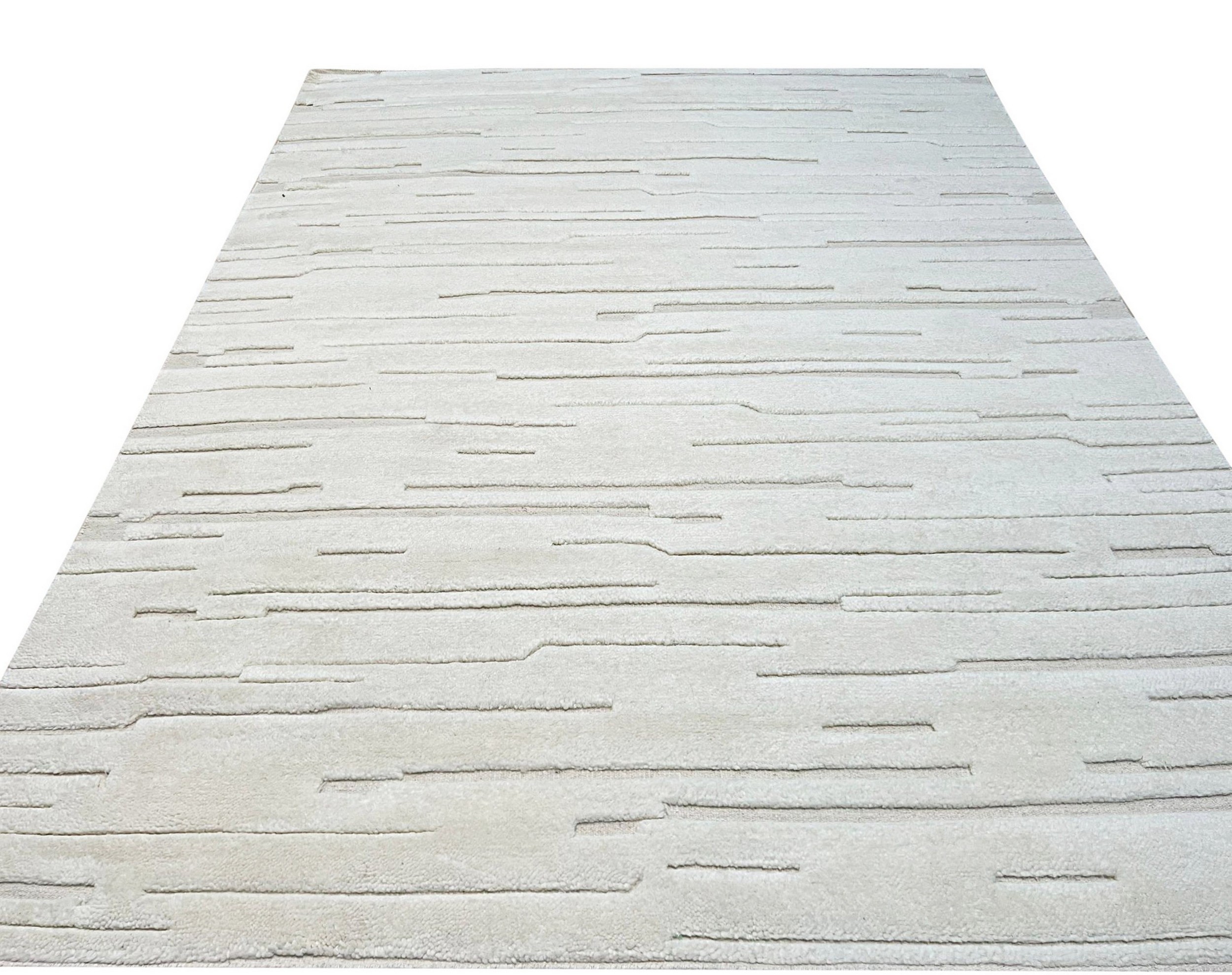The design utilizes a minimalist, textural approach, featuring subtle horizontal striations that create dynamic movement across the field. Rendered primarily in a pristine, nuanced ivory, this rug provides essential brightness and neutrality. It joins our curated collection of refined white color rugs, offering designers a versatile anchor for monochromatic or highly saturated spaces.