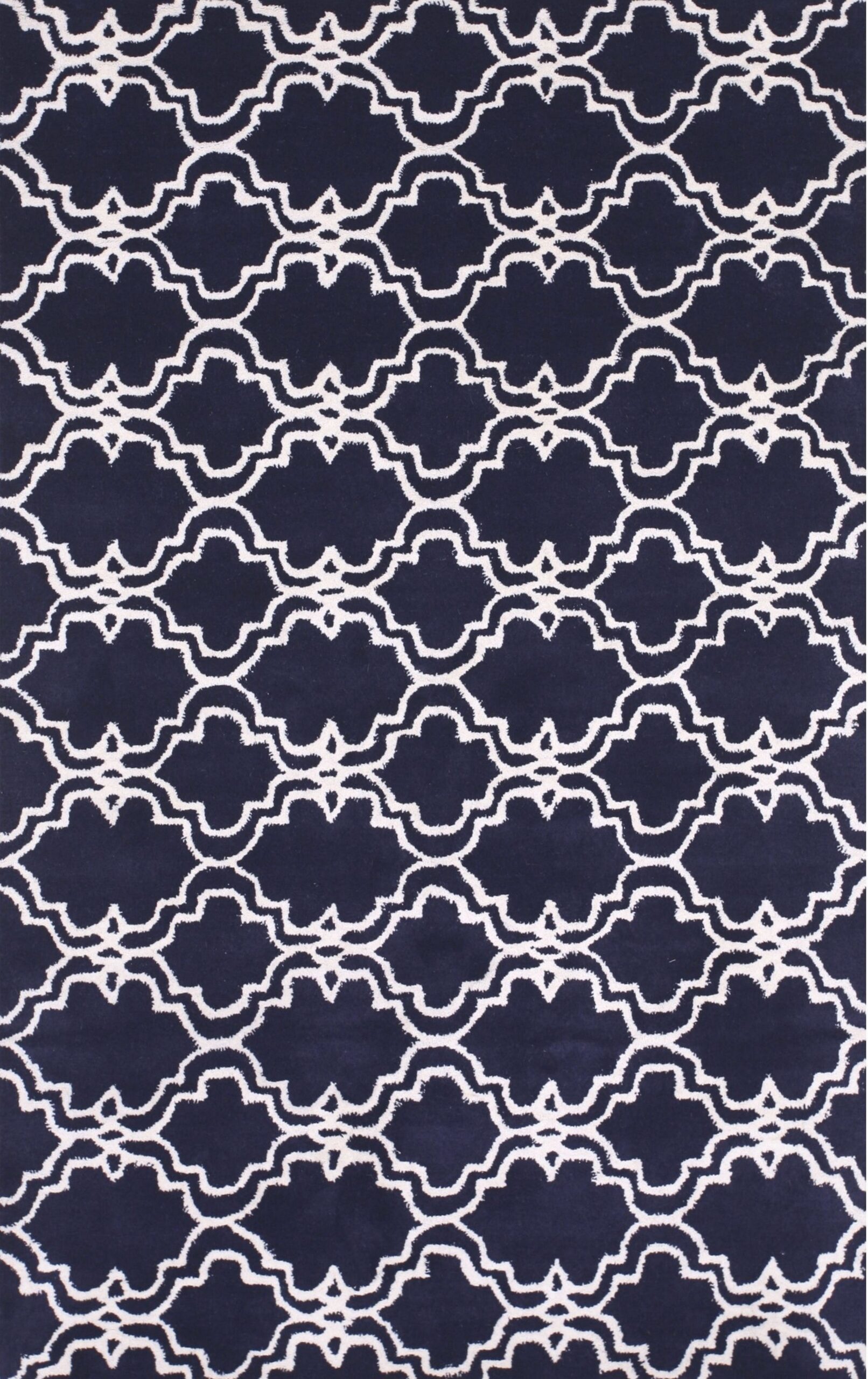 Penelope Moroccan Blue Hand Tufted Wool Rug. This striking piece offers a contemporary interpretation of the classic Moroccan trellis motif. Crafted from luxurious hand-tufted wool, the rug features a repeating ogee pattern that provides geometric rhythm and visual structure to any interior space.
