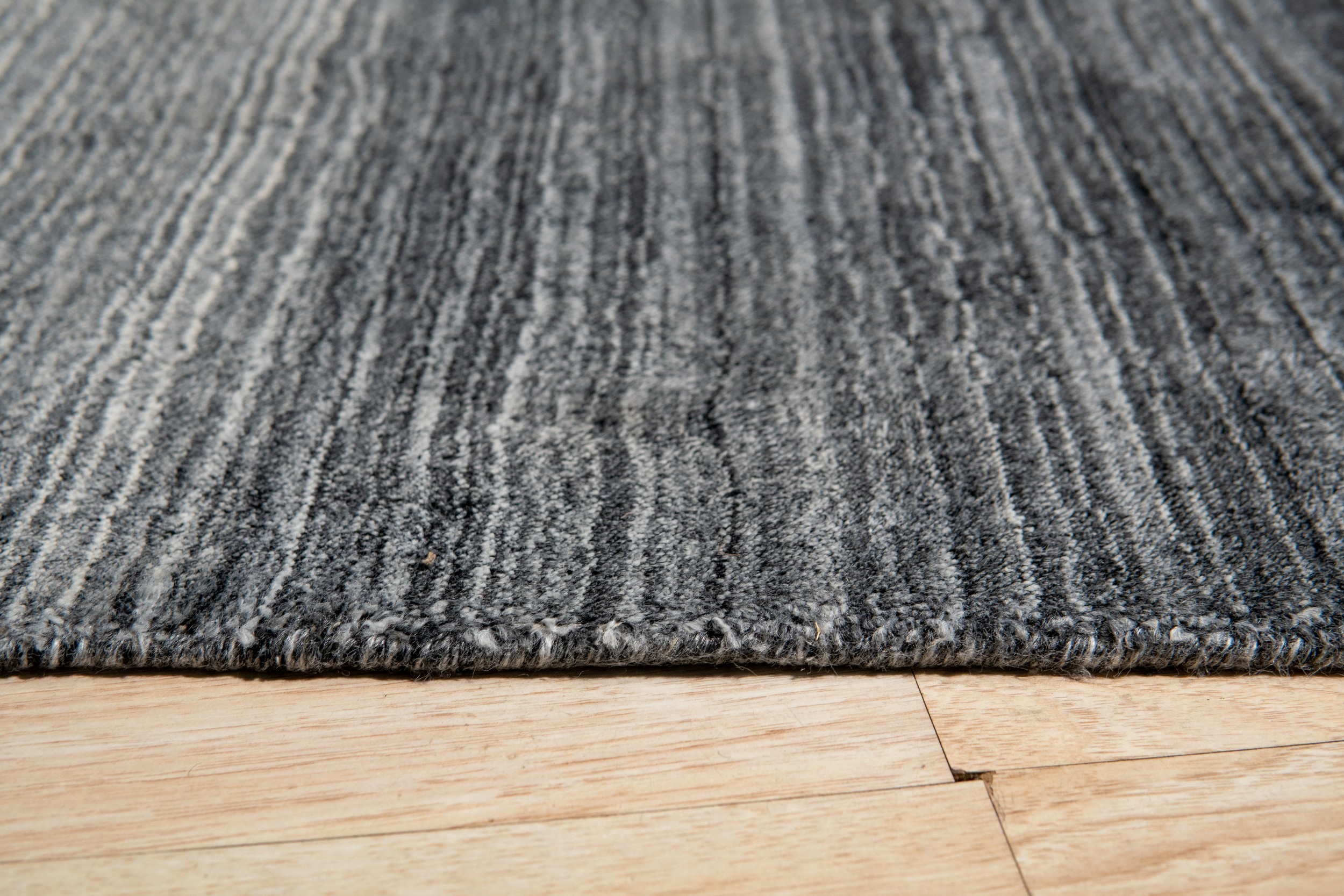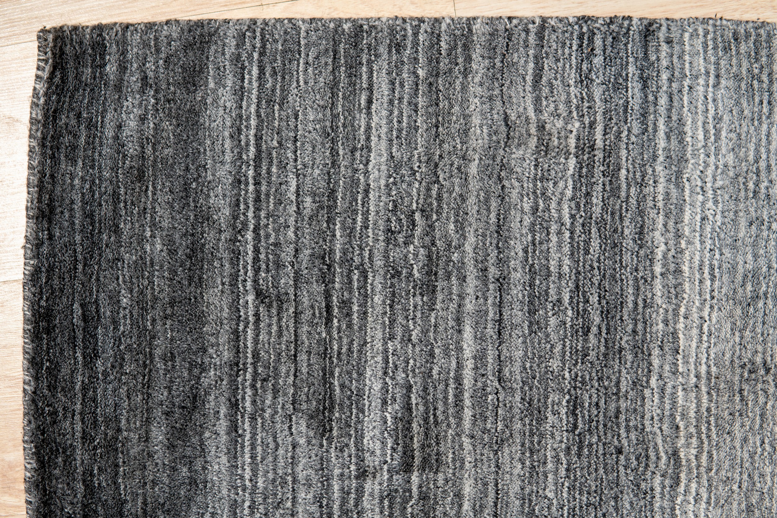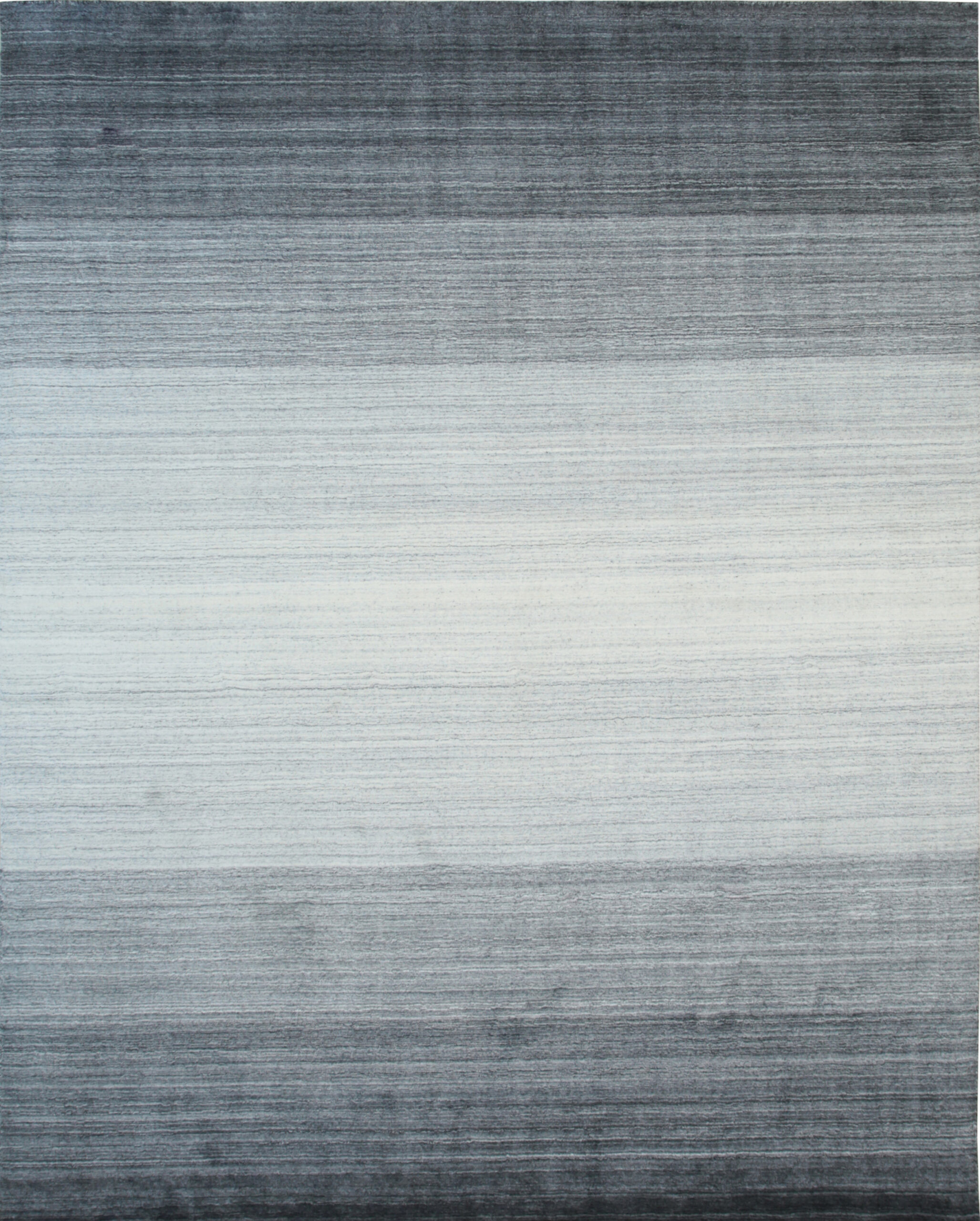 Penelope Nina Charcoal Handmade Wool Rug, Country of Origin: India. This exceptional piece offers a sophisticated interpretation of modern design, utilizing a dramatic horizontal gradient to transition seamlessly from deep charcoal to soft, ethereal grey. The subtle texture and striated pattern showcase the masterful weaving techniques developed by artisans in Indian rugs.