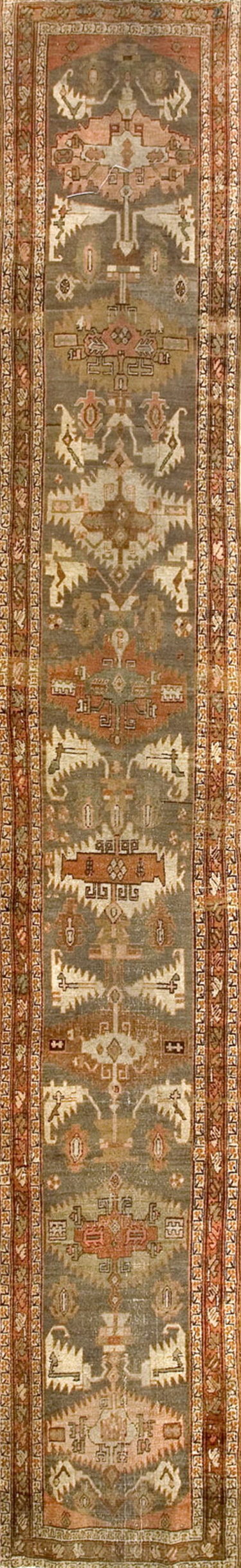 Antique Serapi Large Hallway Runner Wool Green Rug, Country of Origin: Iran / Persia, Circa Date: 1880s. This exceptional piece represents the finest weaving tradition of the Serab region. Characterized by its robust construction and bold, geometric interpretation of classic medallion forms, this example is a quintessential specimen of Serapi rugs. The wool quality and high knot density confirm its provenance as a highly desirable 19th-century textile.
