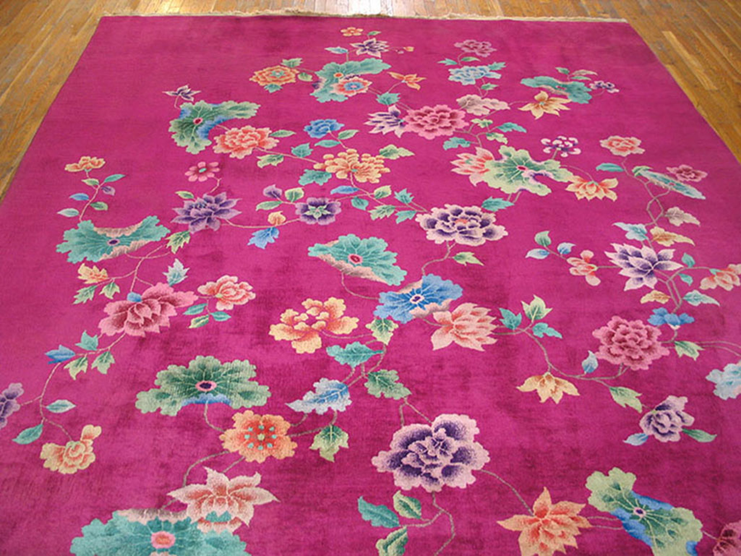 Antique Chinese – Art Deco Coral 1930s Rug, Circa Date: 1930s. This exceptional example of early 20th-century Chinese weaving captures the dramatic aesthetic of the Art Deco movement. The saturated field color, often described as deep magenta or fuchsia, places it among the most sought-after coral color rugs of the period, offering unparalleled vibrancy and depth.